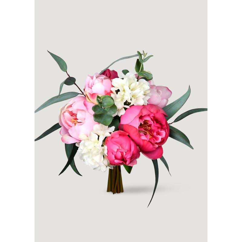 Embrace the versatility of premade artificial flower bouquets to discover an effortless approach to beautifying your home or wedding! This colorful faux bouquet features pink, fuchsia, and cream peony blooms, enhanced by the dimensional and textural elements of green eucalyptus leaves. Style this bouquet of lifelike peonies as a drop-in vase arrangement to create a nature-inspired botanical centerpiece, or separate the bouquet and add more stems to build your dream bridal bouquet.