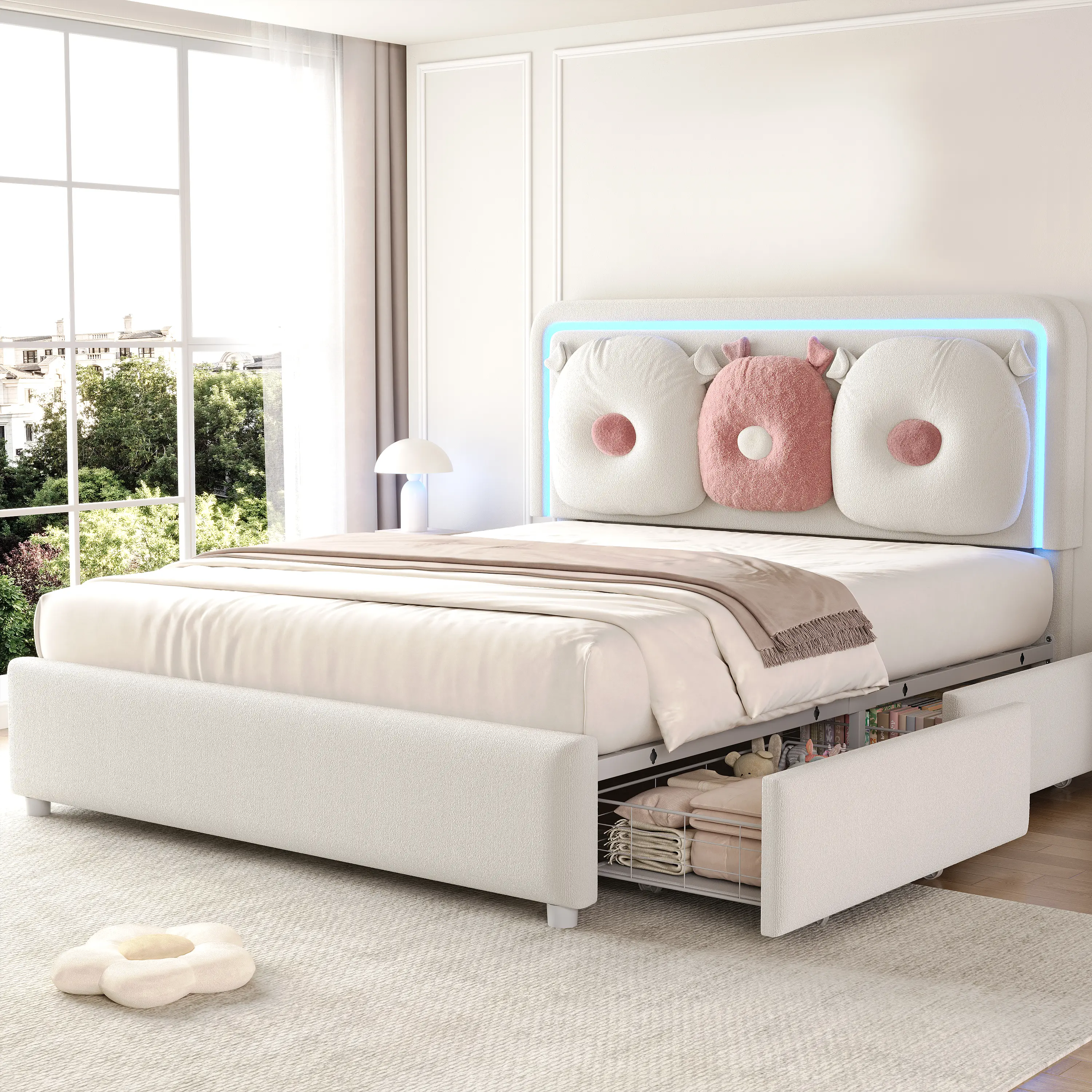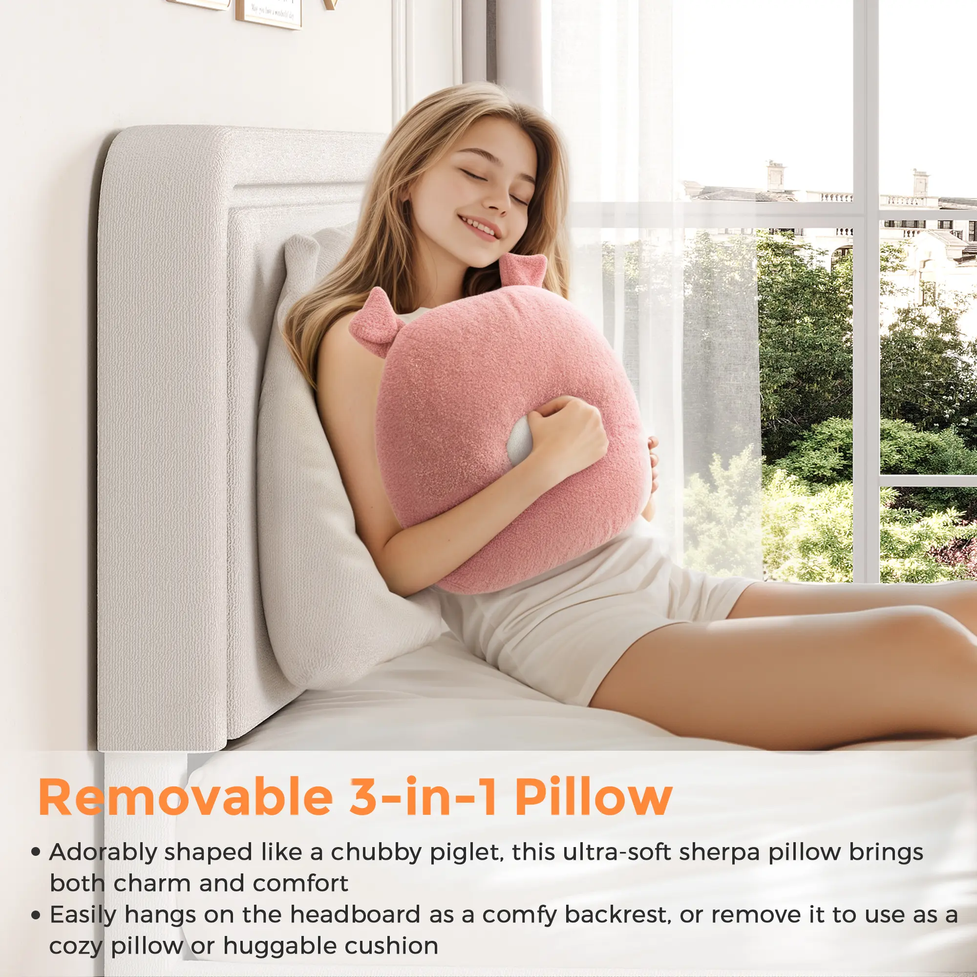 ·CUTE REMOVABLE PILLOWS: This princess bed comes with 3 soft pillows, including two in white and one in pink. Each pillow is made from fluffy boucle fabric and designed in a cute shape. The pillows can be easily attached to the headboard with button loops to act as cozy backrests or removed to use as snuggly pillow or cuddle buddies. This boucle bed frame brings fun and functionality together for your dream room