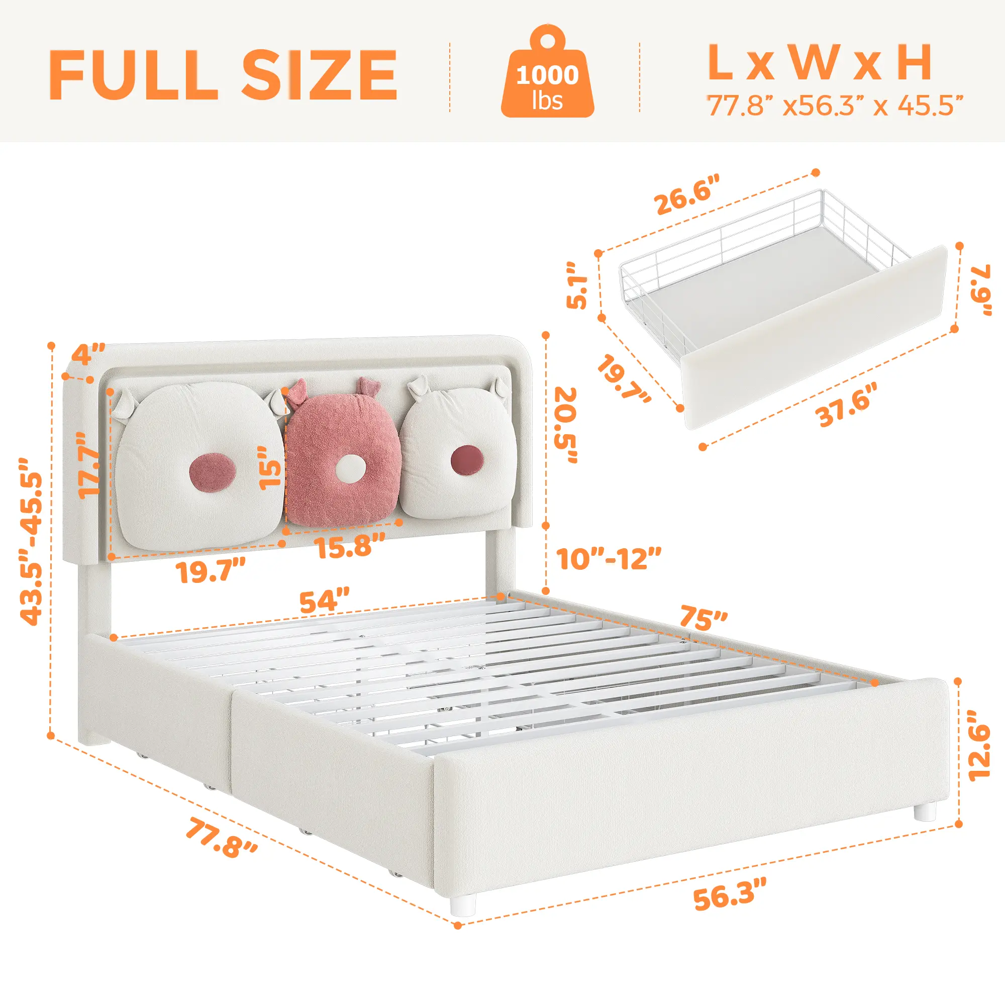 ·FLEXIBLE DRAWER POSITIONING FOR ANY ROOM SETUP: This full bed frame with 2 drawers offers unmatched flexibility—place the drawers in any of the 4 side positions. Put both drawers near the footboard for more space by your nightstand, or place them on one side to fit against a wall. The spots without drawers are still covered with soft upholstered panels that match the drawer fronts, keeping the entire white bed frame looking clean and complete