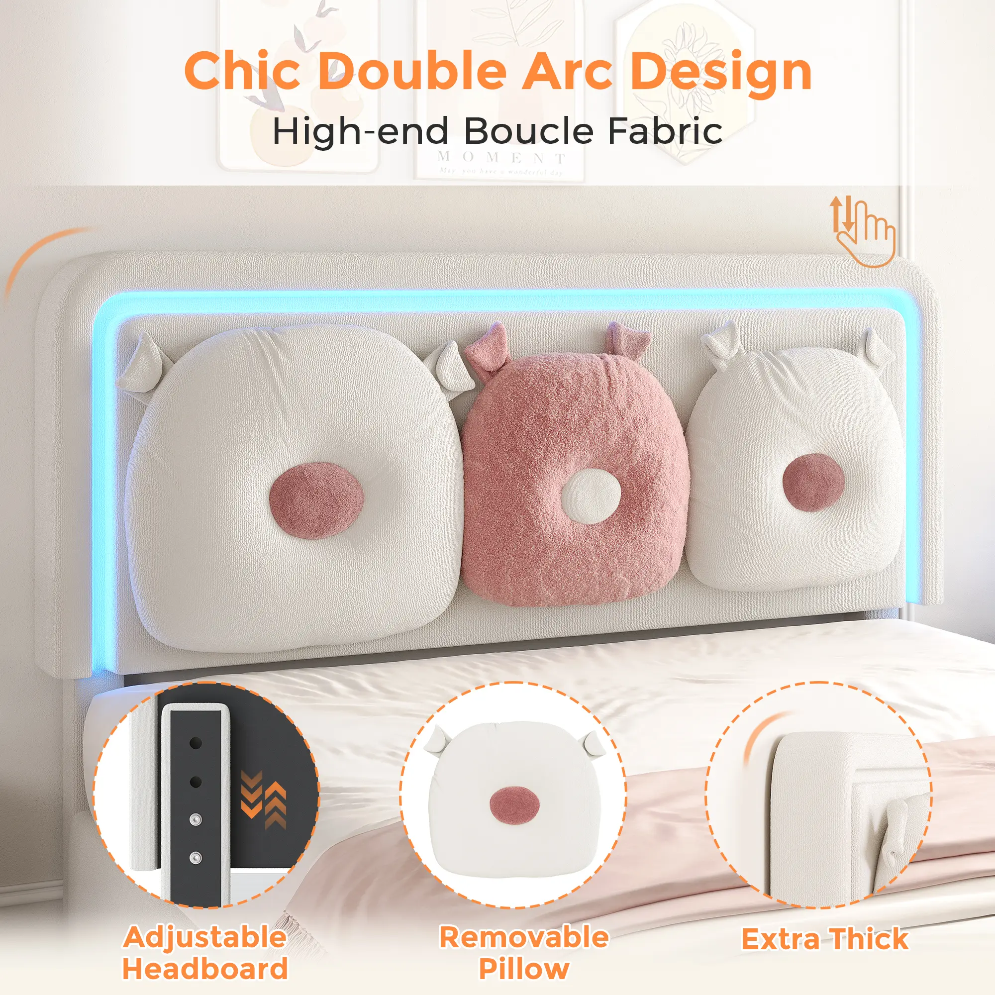 ·CHARMING ADJUSTABLE HEADBOARD DESIGN: This full bed frame with double arc headboard that combines elegance with whimsy. Upholstered in skin-friendly, soft sponge-padded material and wrapped in luxurious boucle fabric, this bed frame offers exceptional comfort and visual appeal. The adjustable headboard height easily fits different mattress thicknesses, giving your child the support they need while reading or watching TV in bed. A charming blend of classic style and modern design for any girl's room