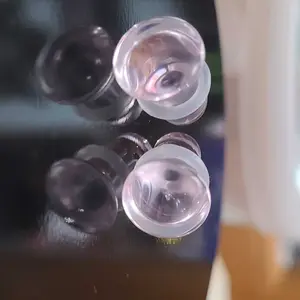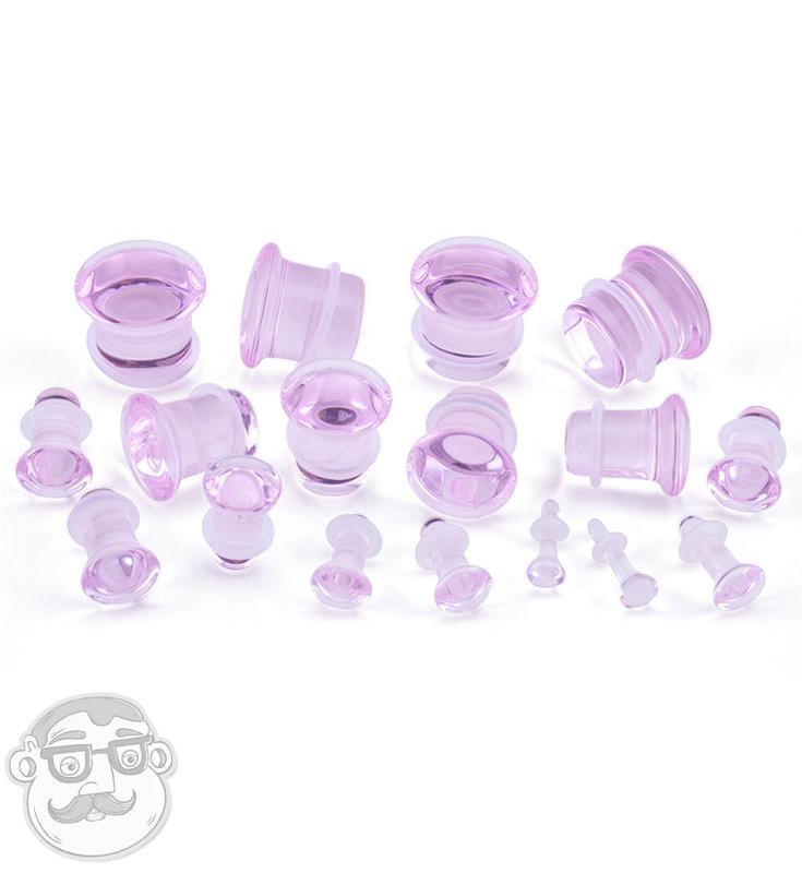 Pink glass single flare plugs in any of the following sizes: 8 gauge (3mm), 6 gauge (4mm), 4 gauge (5mm), 2 gauge (6mm), 0 gauge (8mm), 00 gauge (10mm), 7/16" (11mm), 1/2 inch (12mm).