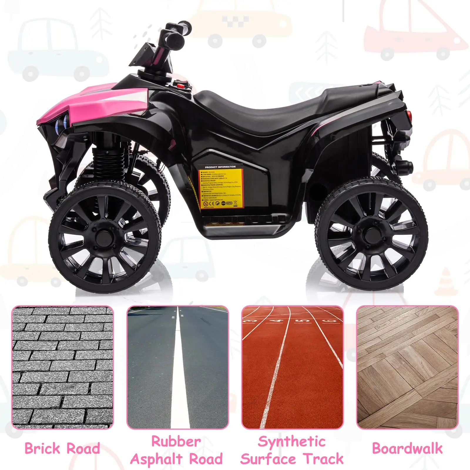PERFECT GIFT FOR KIDS: The ride on toy for big kids is made of durable PP material and is ASTM certified to ensure its reliability. The four Wheeler Electric Quad is a trustworthy and good companion for kids. Dimensions: 27.56"(L) x 16.53"(W) x 17.72"(H)