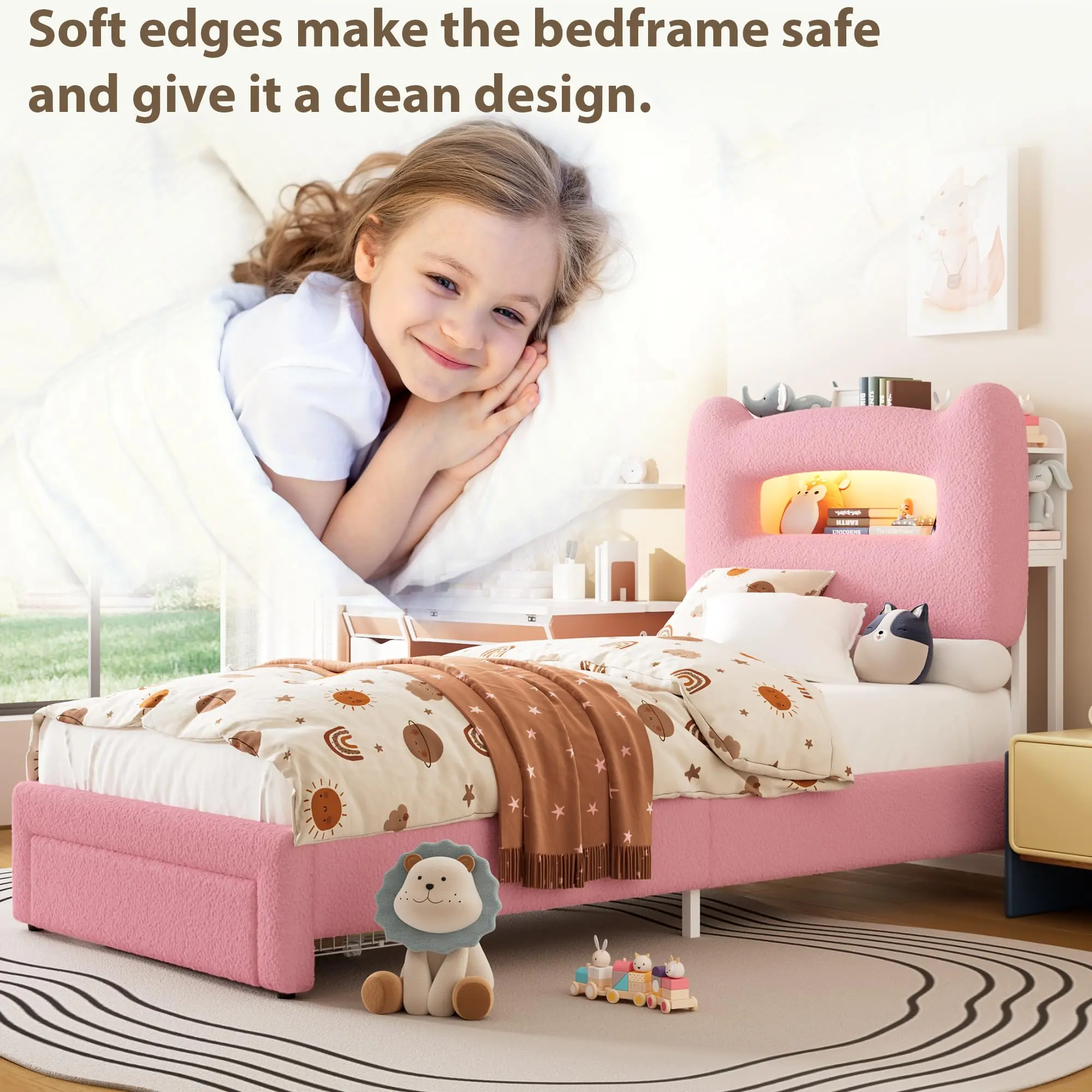 【Smart Upholstered LED Bed with Charging Station】Upgrade your room with this Upholstered LED Bed Frame. The headboard includes app-controlled RGB lights and a built-in charging station (2 outlets, 2 USB, 1 Type-C). Combined with its 3-side storage, it’s the perfect kids bed for tech-savvy users who need functionality and style.