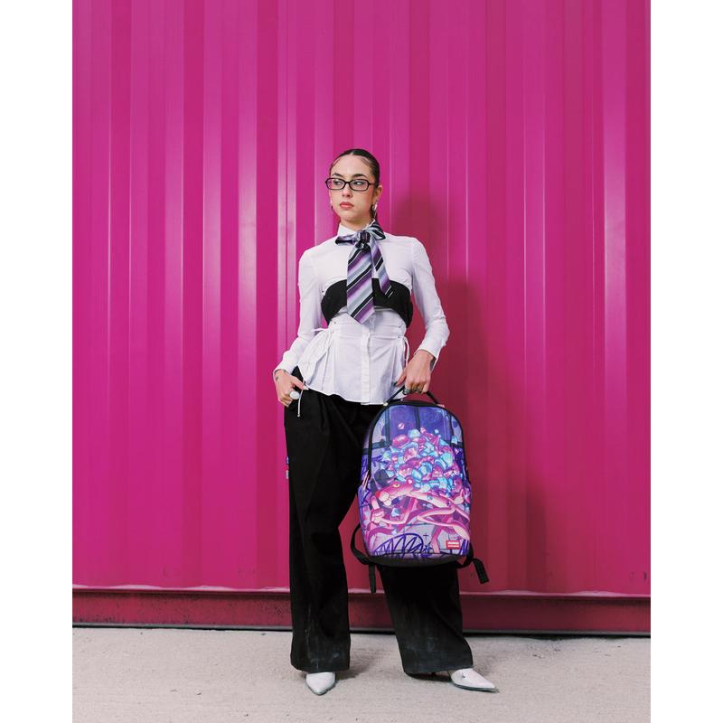 Dimensions: 18" x 6" x 11.5" • Front zipper pocket • Side pockets • Zippered Stash pocket • Separate velour sunglass compartment • Ergonomic mesh back padding • Adjustable Straps for custom sizing • Gold zippers with metal hardware • Metal "Sprayground Authentic" badge • Slide through back sleeve connects to carry-on luggage to free your hands