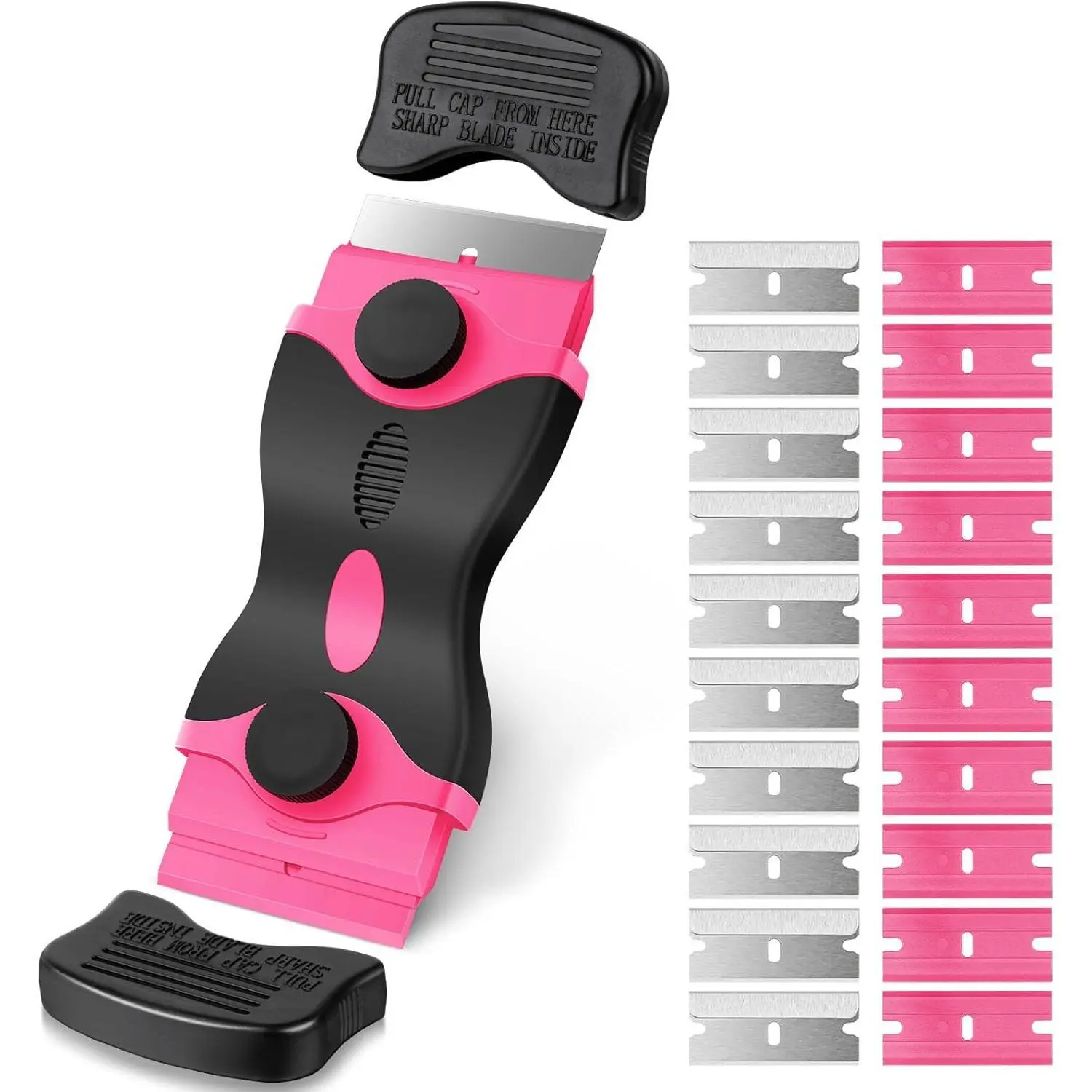 Use these scrapers for cleaning and removing various materials. They are particularly useful for adhesive, stickers, decals, glass, labels, and car windows. The set provides ample blades for multiple cleaning tasks.