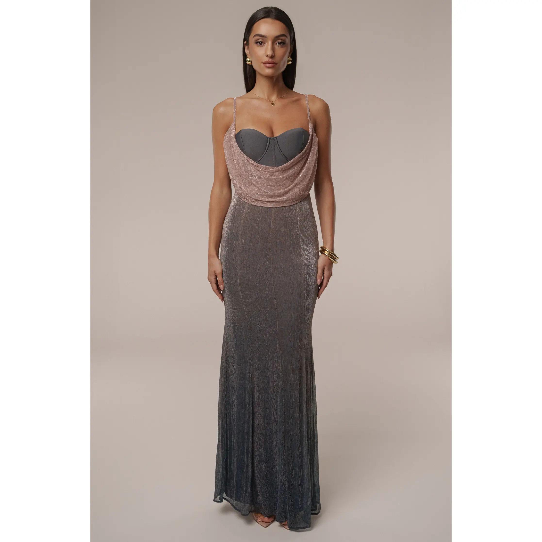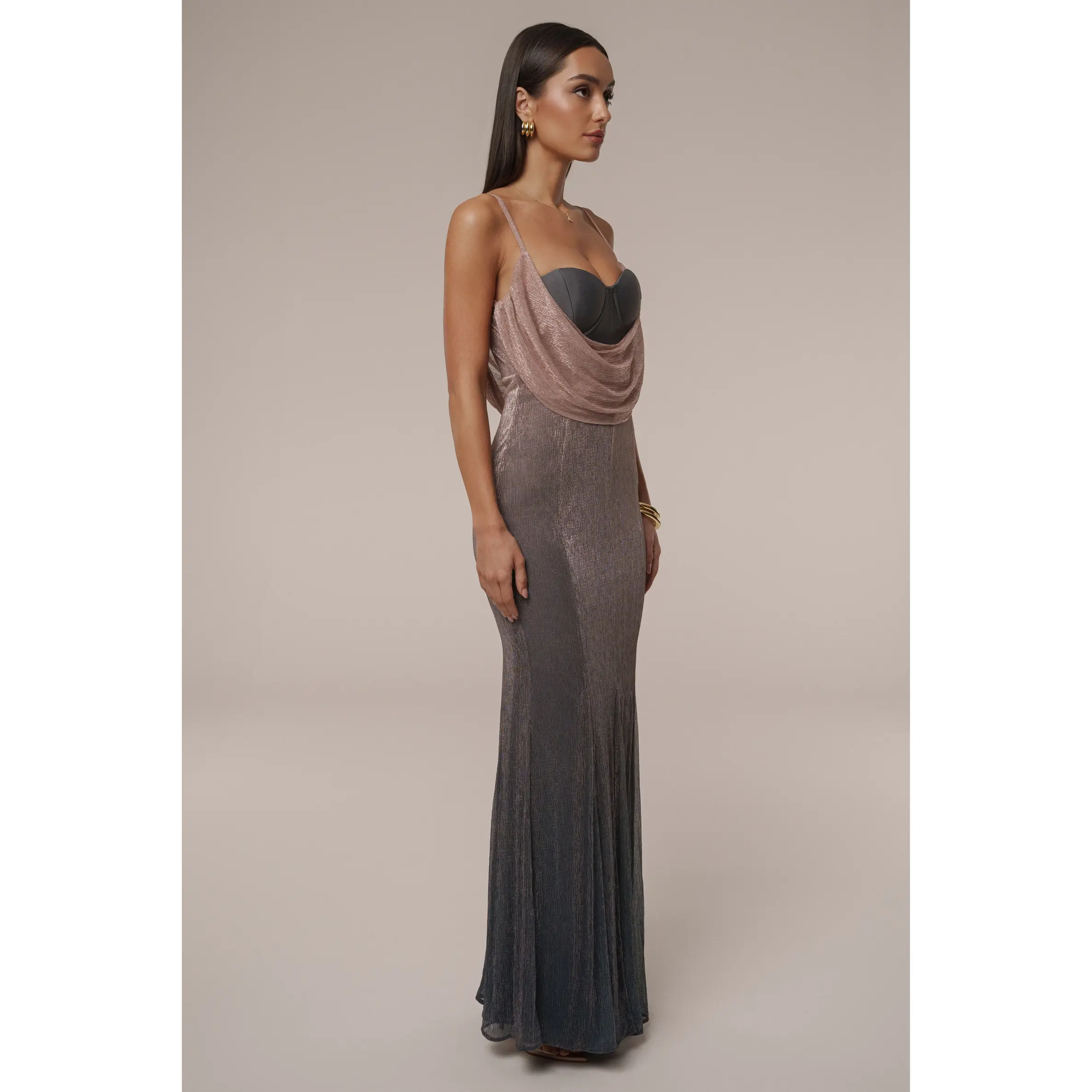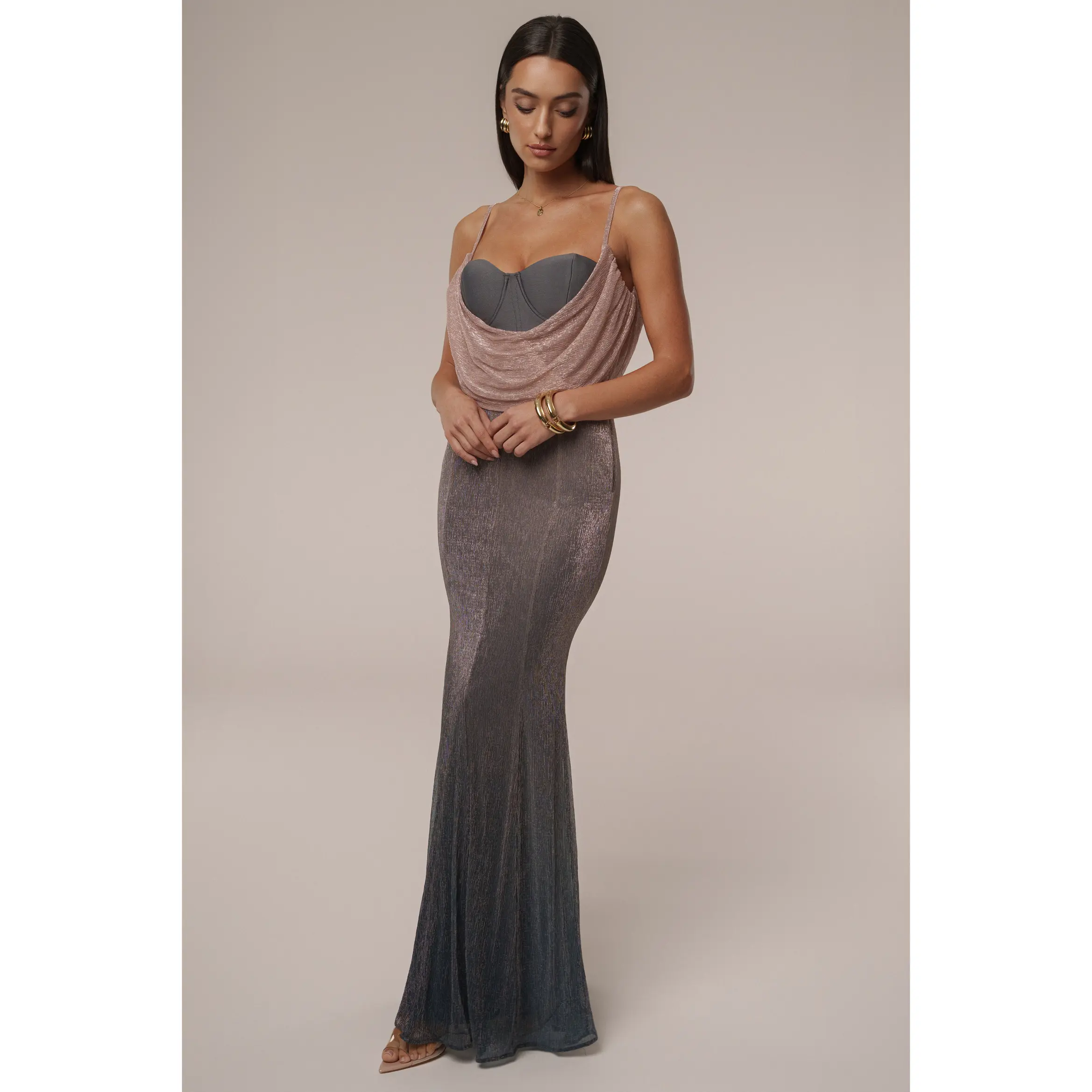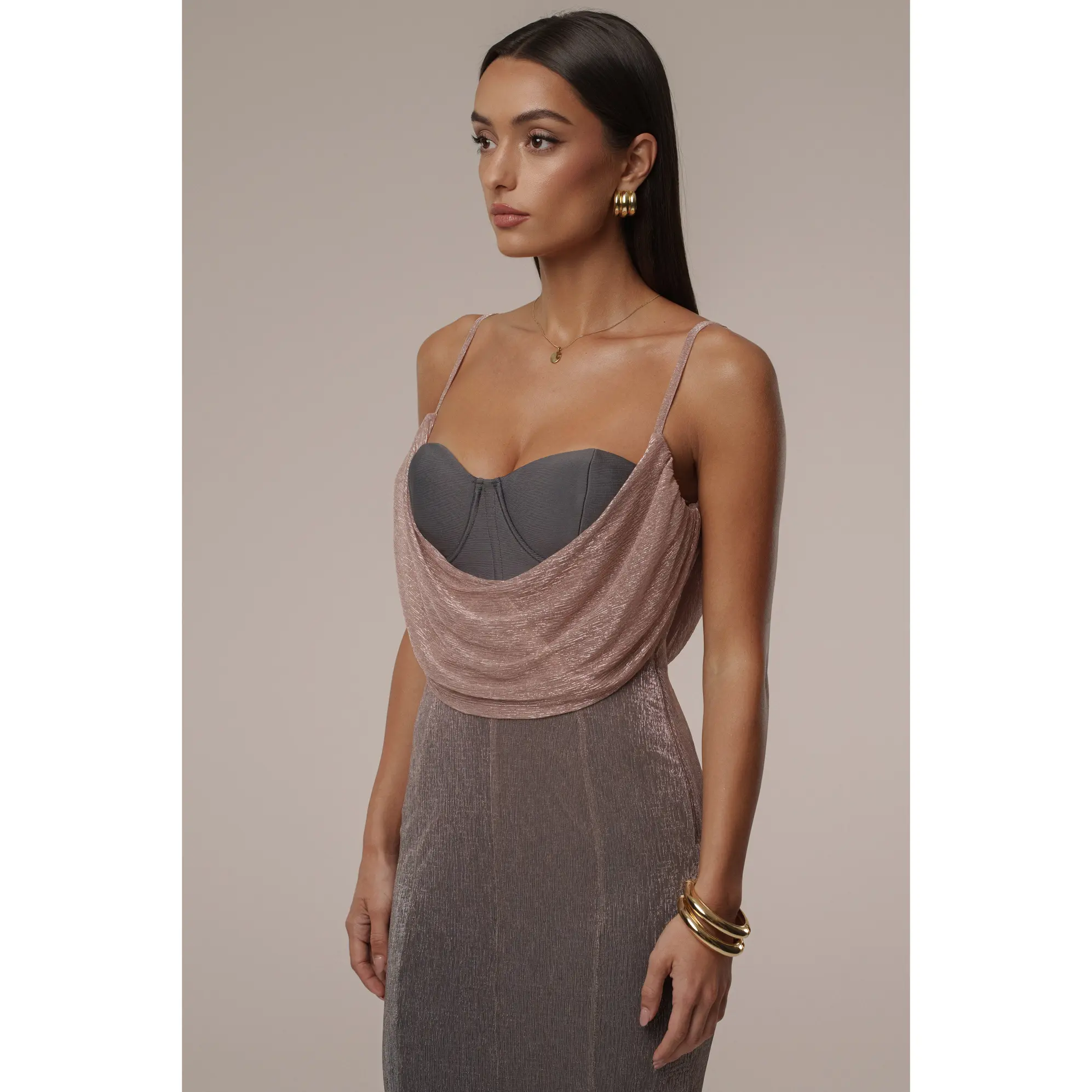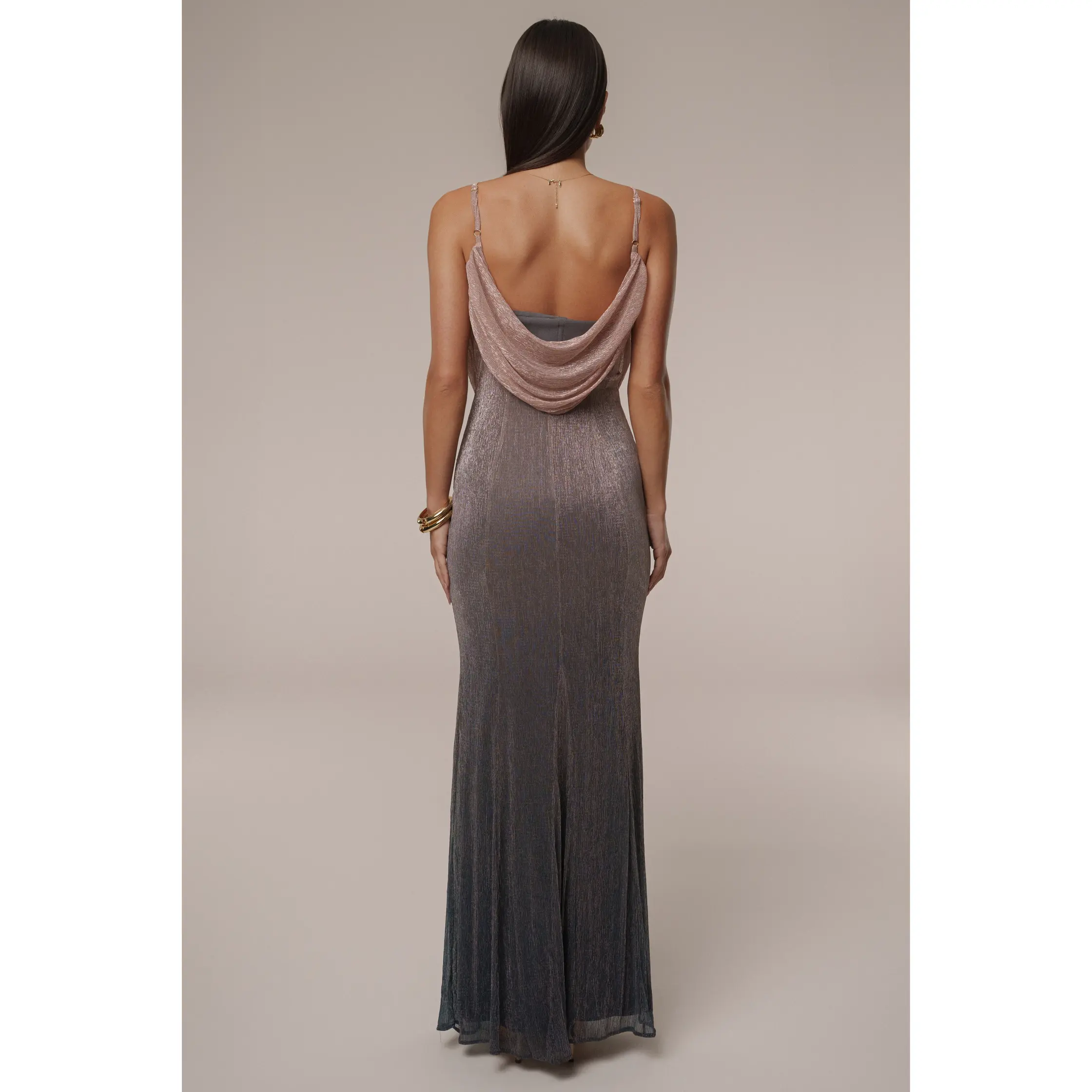Be the star of the night in our Pink Shimmery Nights Maxi Dress. Inspired by our best-seller, the Celestina Draped Dress, this piece is crafted from a blend of bandage knit and lurex mesh, delivering a shimmering ombré effect that radiates elegance. With a front/back cowl drape, adjustable shoulder straps, and interior lining for coverage and comfort, this dress is perfect for the festive season. Complete with a side zipper and non-slip silicone gel at the bust for a secure fit. Medium stretch.