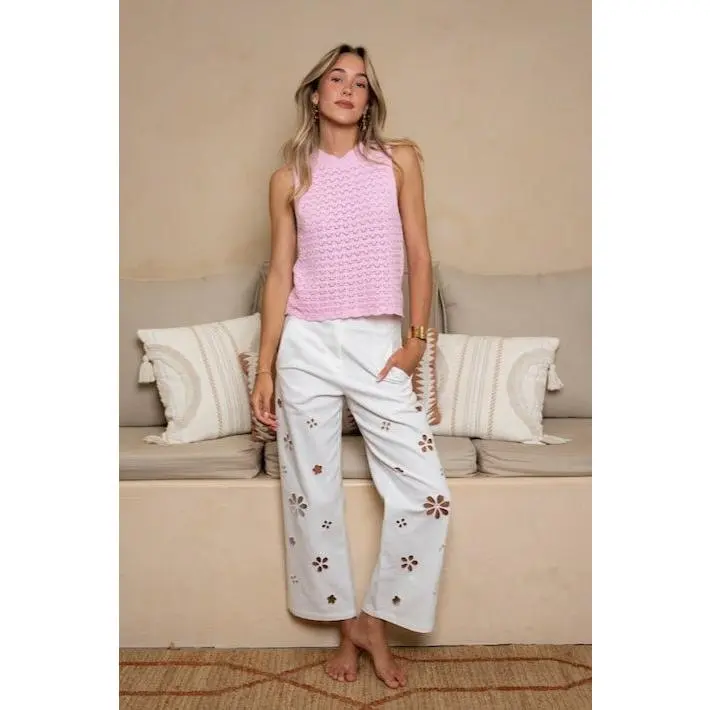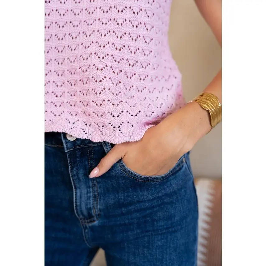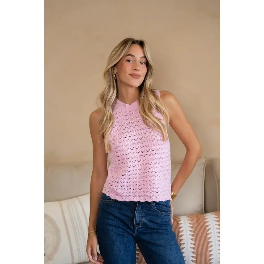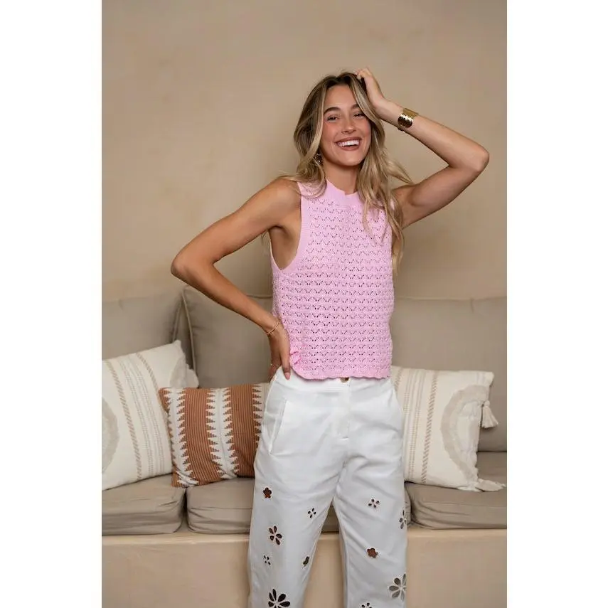 Add a touch of playful charm with the Pink Sely Top. This sleeveless crochet piece features a classic round neckline and a slightly cropped fit, making it light, airy, and perfect for layering or wearing on its own during warm days.