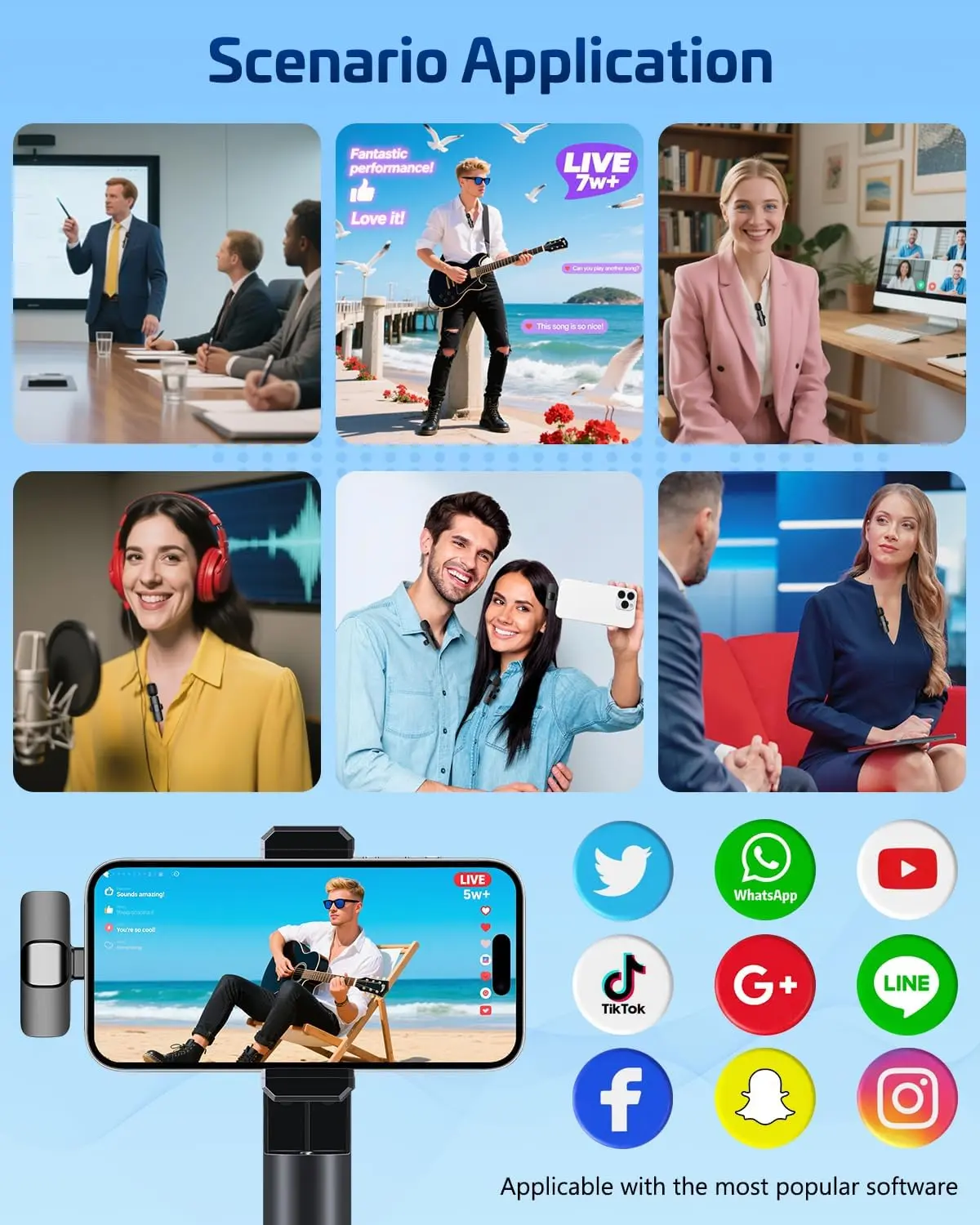 ·Universal Wireless Mic for All Devices Works seamlessly with iPhone (Lightning or Type-C), Android (Type-C). This tiny wireless microphone comes with all necessary adapters - Just plug and record instantly.