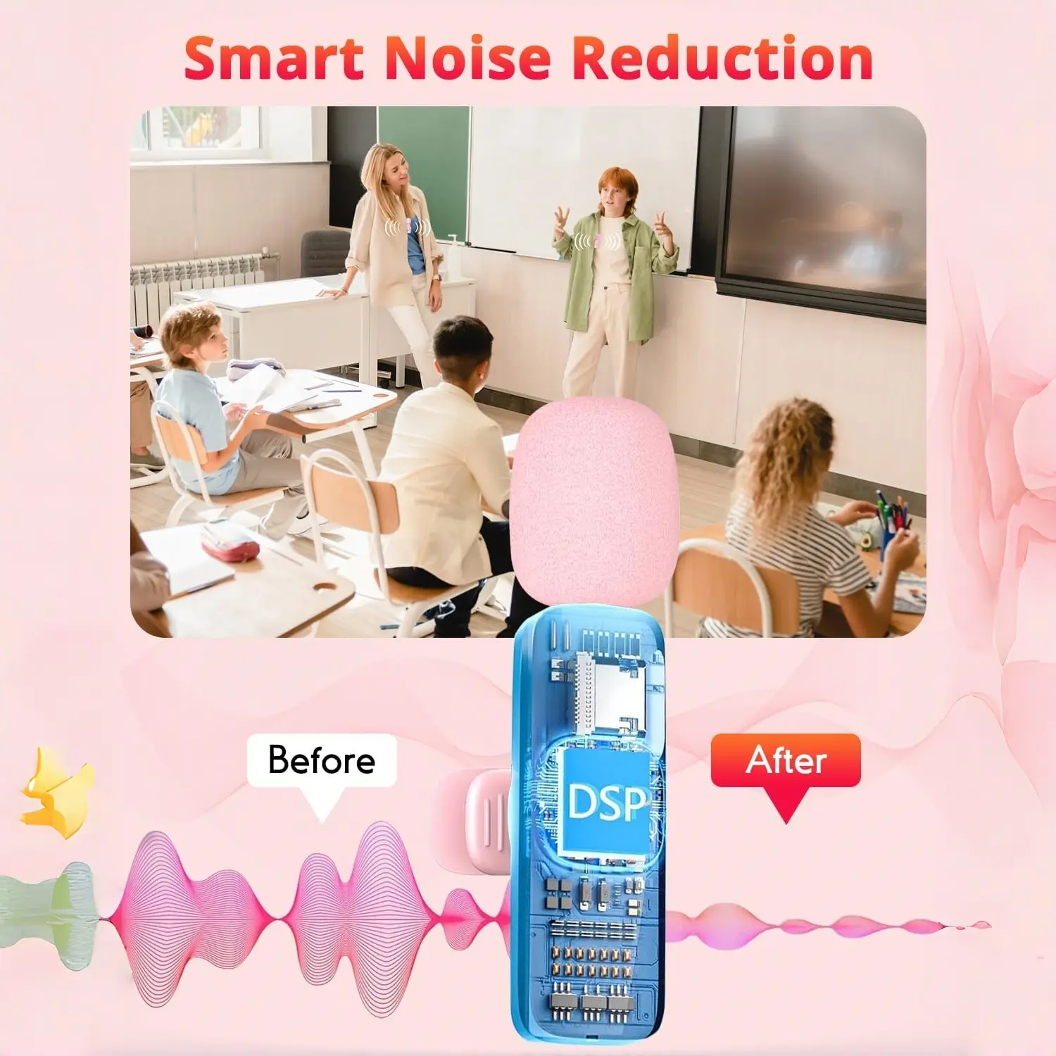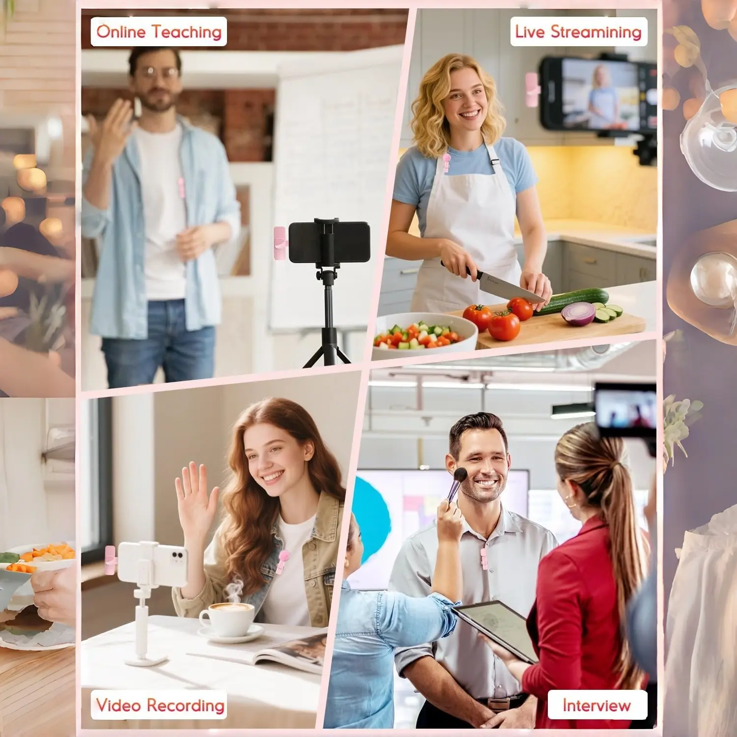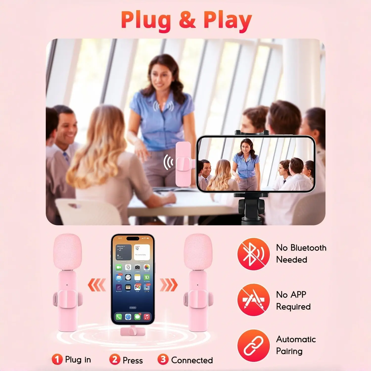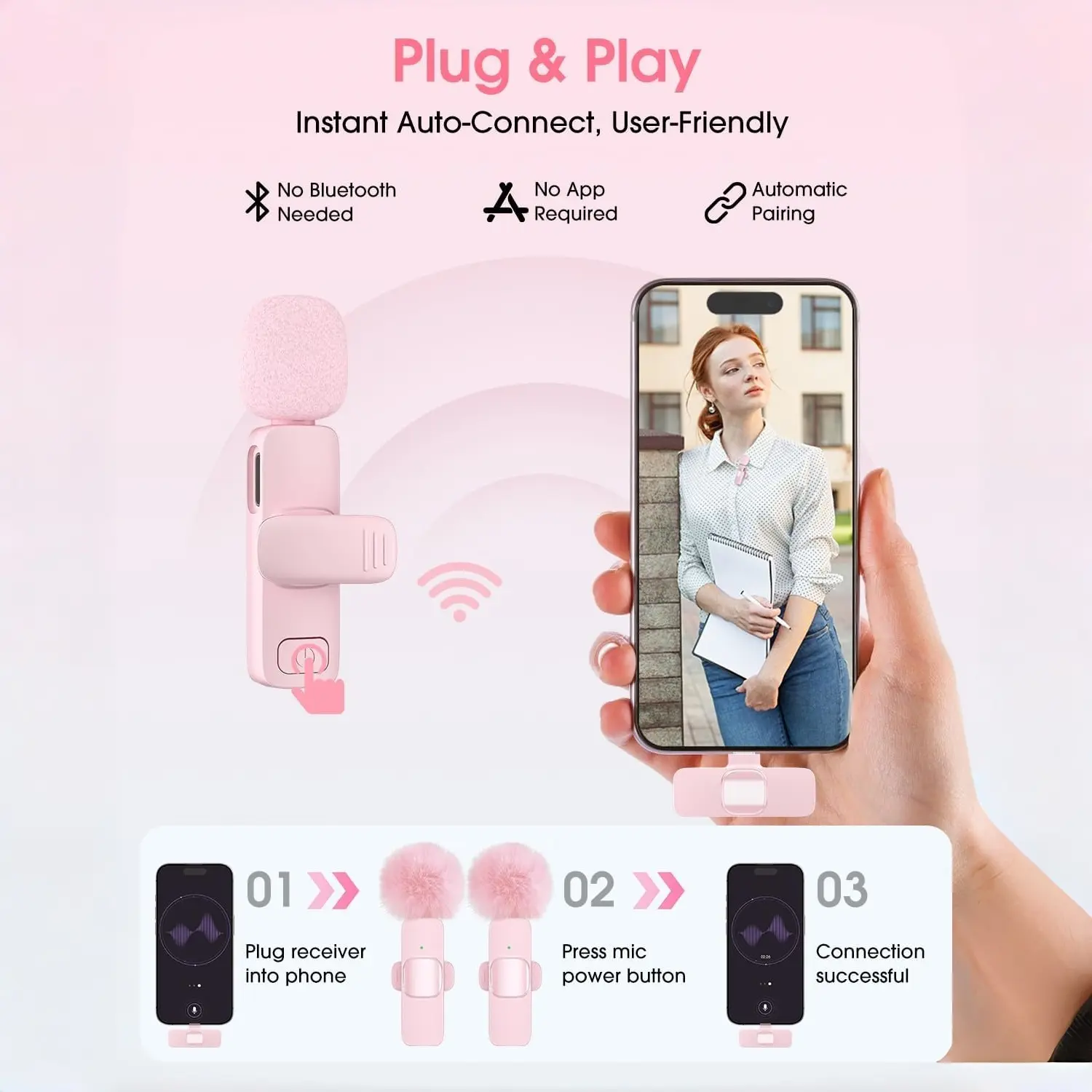 ·2-in-1 Fast Charging for iPhone & Android Dual Type-C ports charge 2 pink mini microphones simultaneously in just 1 hour. Enjoy 8+ hours total recording time by alternating mics - perfect for all-day live streams, TikTok videos, and podcasts.