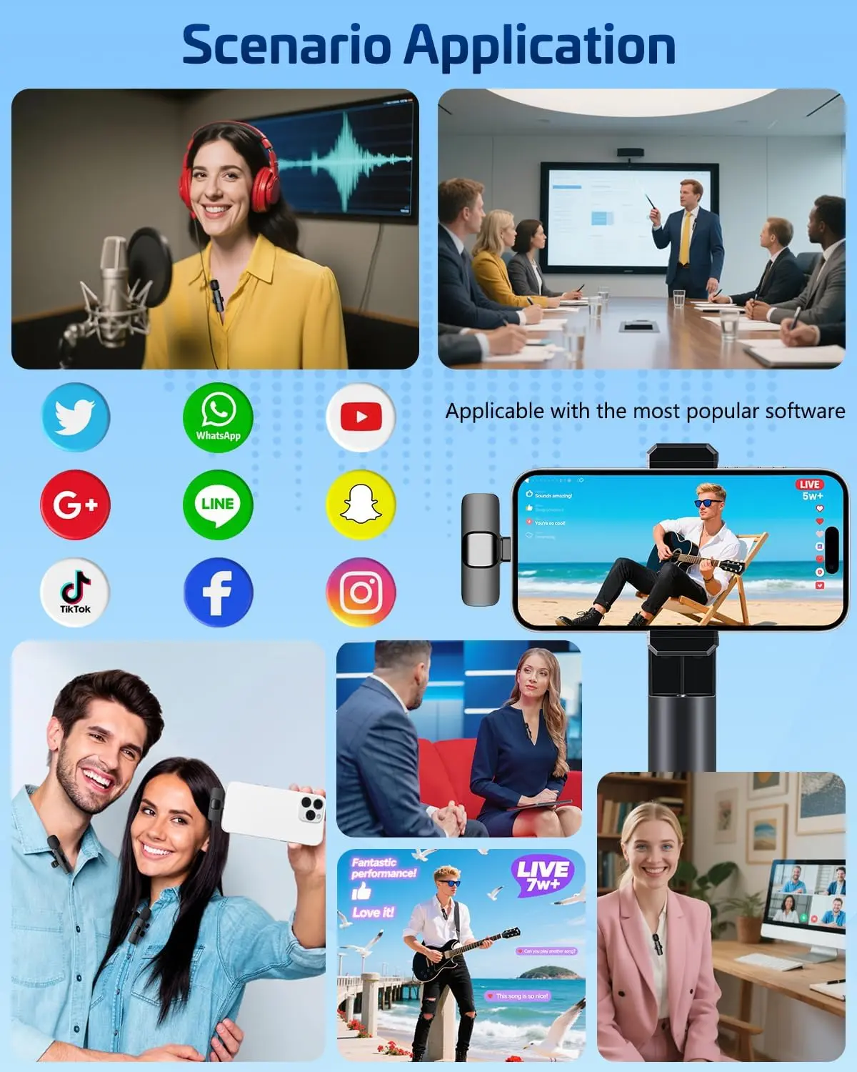 ·Universal Wireless Mic: Works seamlessly with iPhone (Lightning or Type-C) and Android (Type-C). Comes with necessary adapters. Just plug and record instantly.