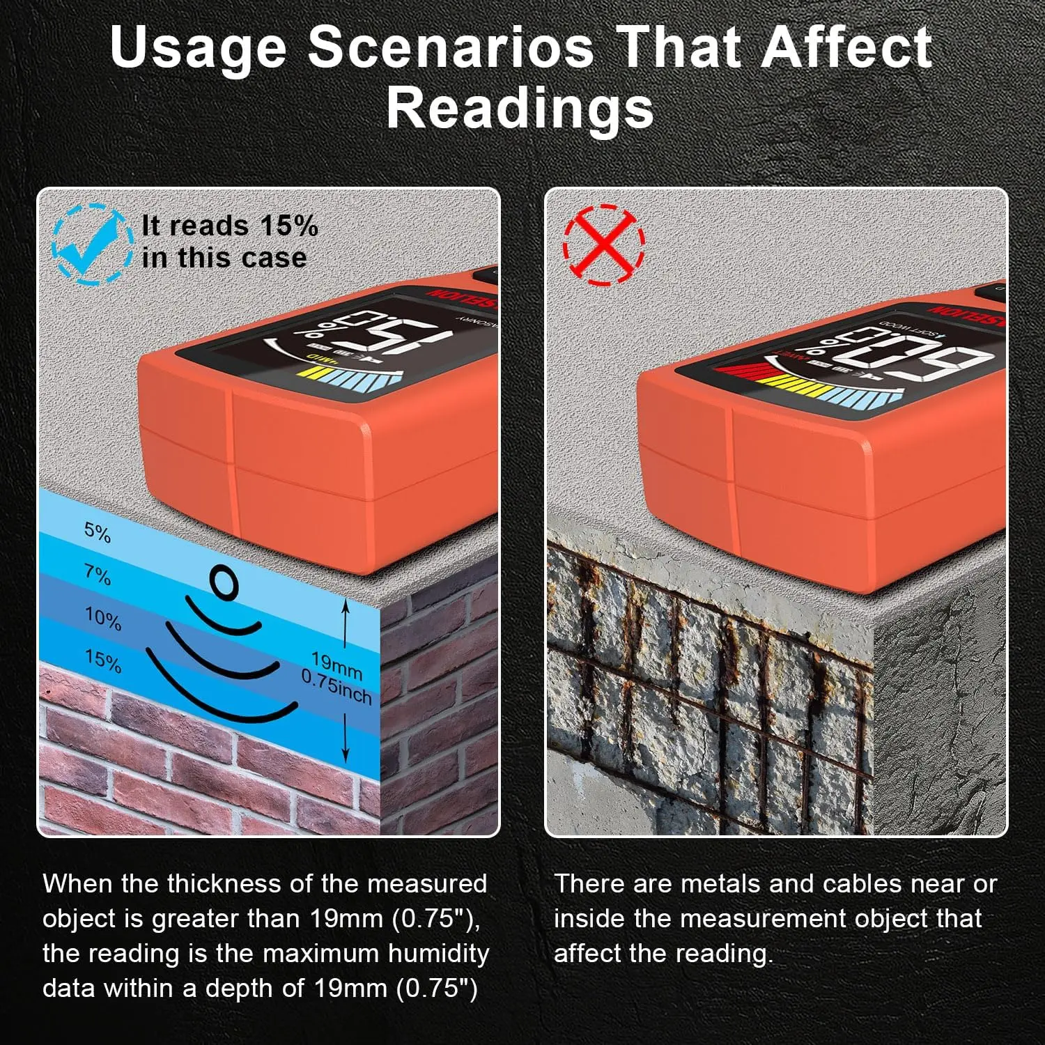 Surface Prep: Ensure the surface is clean and dry.Avoid measuring on materials placed on wetter surfaces.
