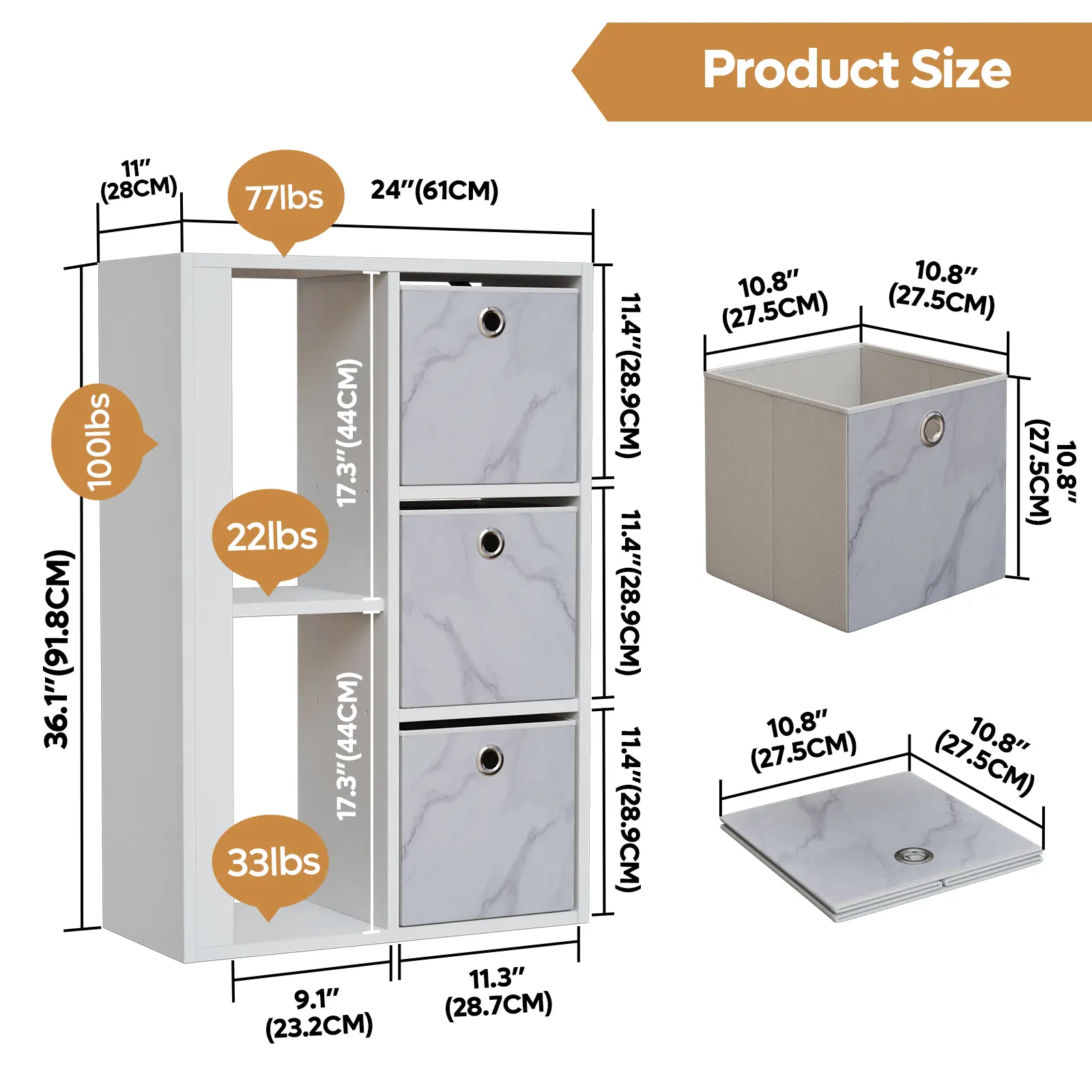 ·5 Cubes Bookcase: This cube with 5 storage compartments, can provide multi-function storage space, to facilitate effective display and classification of various daily items, such as books, photos, and toys. The 3 foldable marbled fabric drawers combine the open design with hidden storage. The top surface offers an additional place for displaying picture frames or home decor pieces.