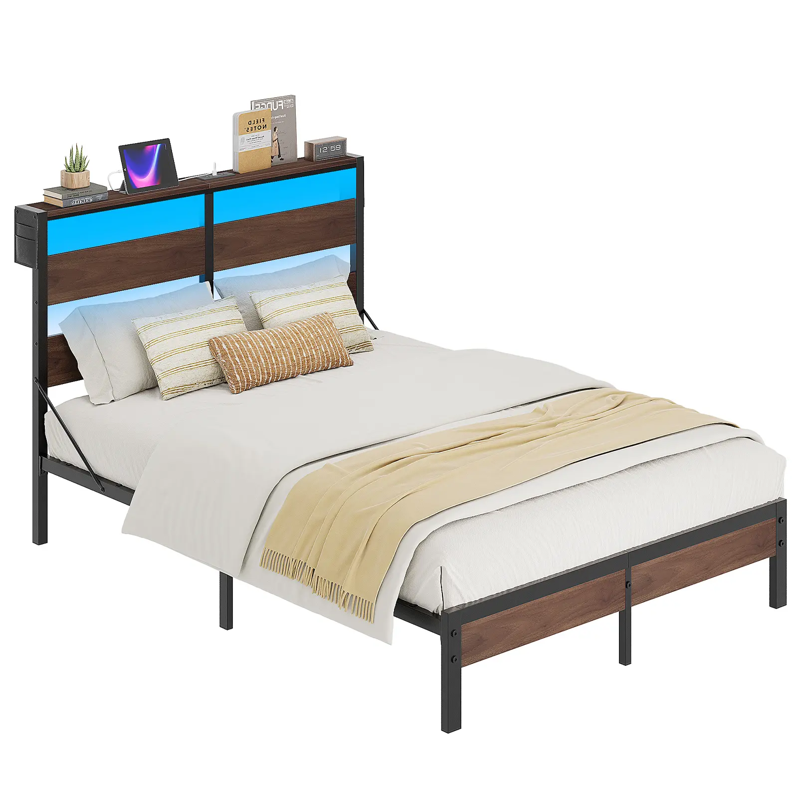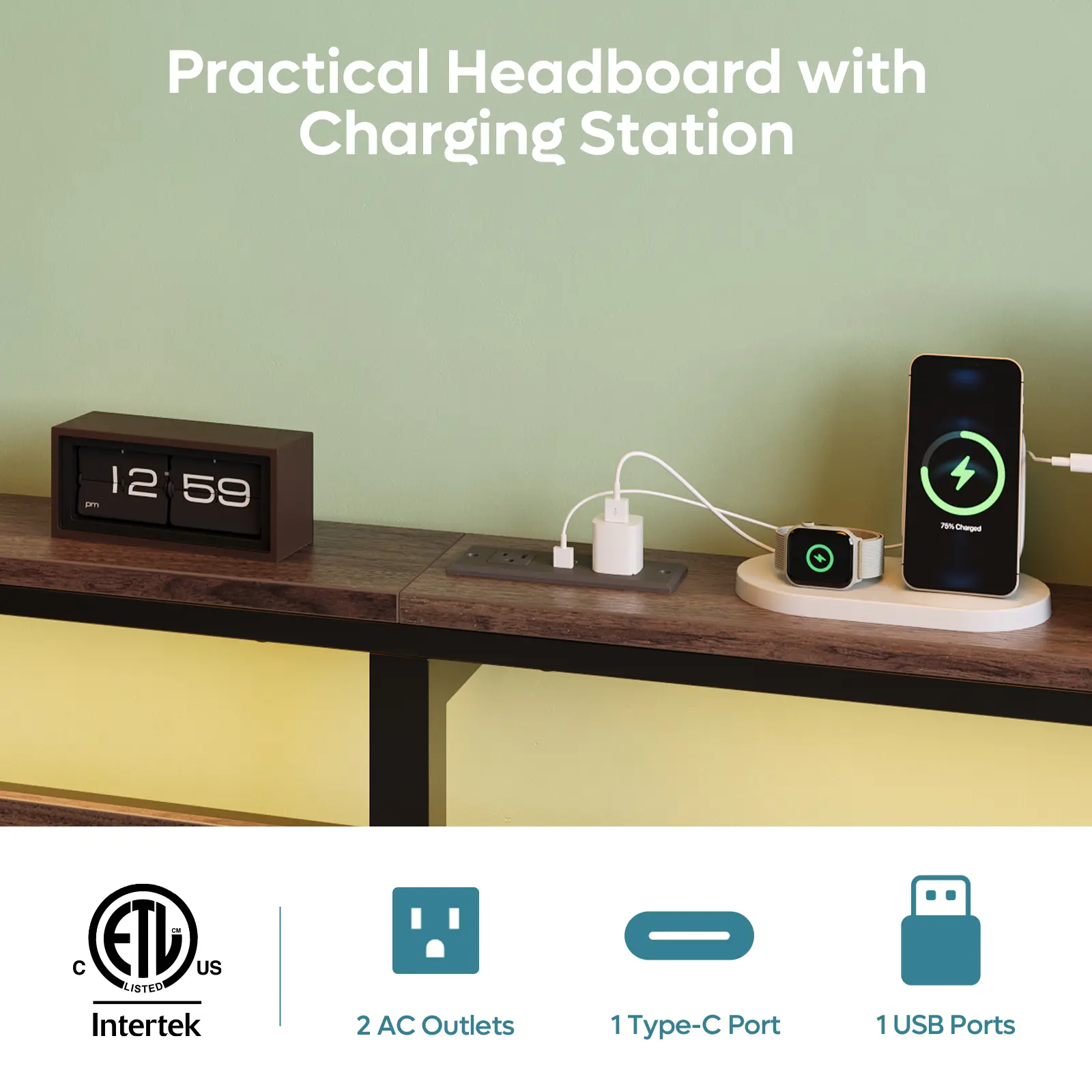 ·【Convenient Charging Station & LED Light】 The bed frame with headboard features 1 Type-C, 1 USB A port, and 2 AC outlets to keep your devices powered and within easy reach. Use the remote, app or wire control to select from 22 dynamic modes and 7 colors to match your mood.