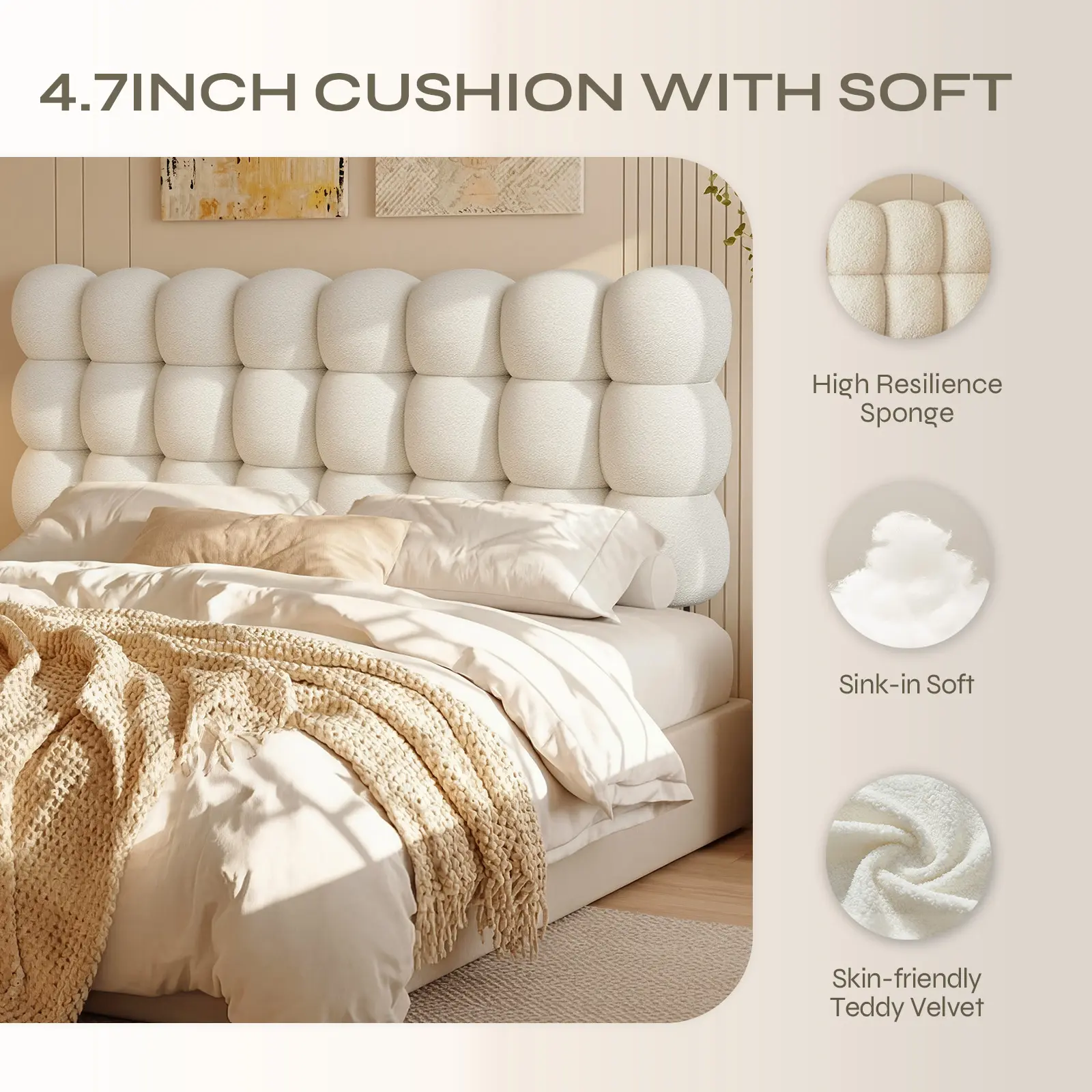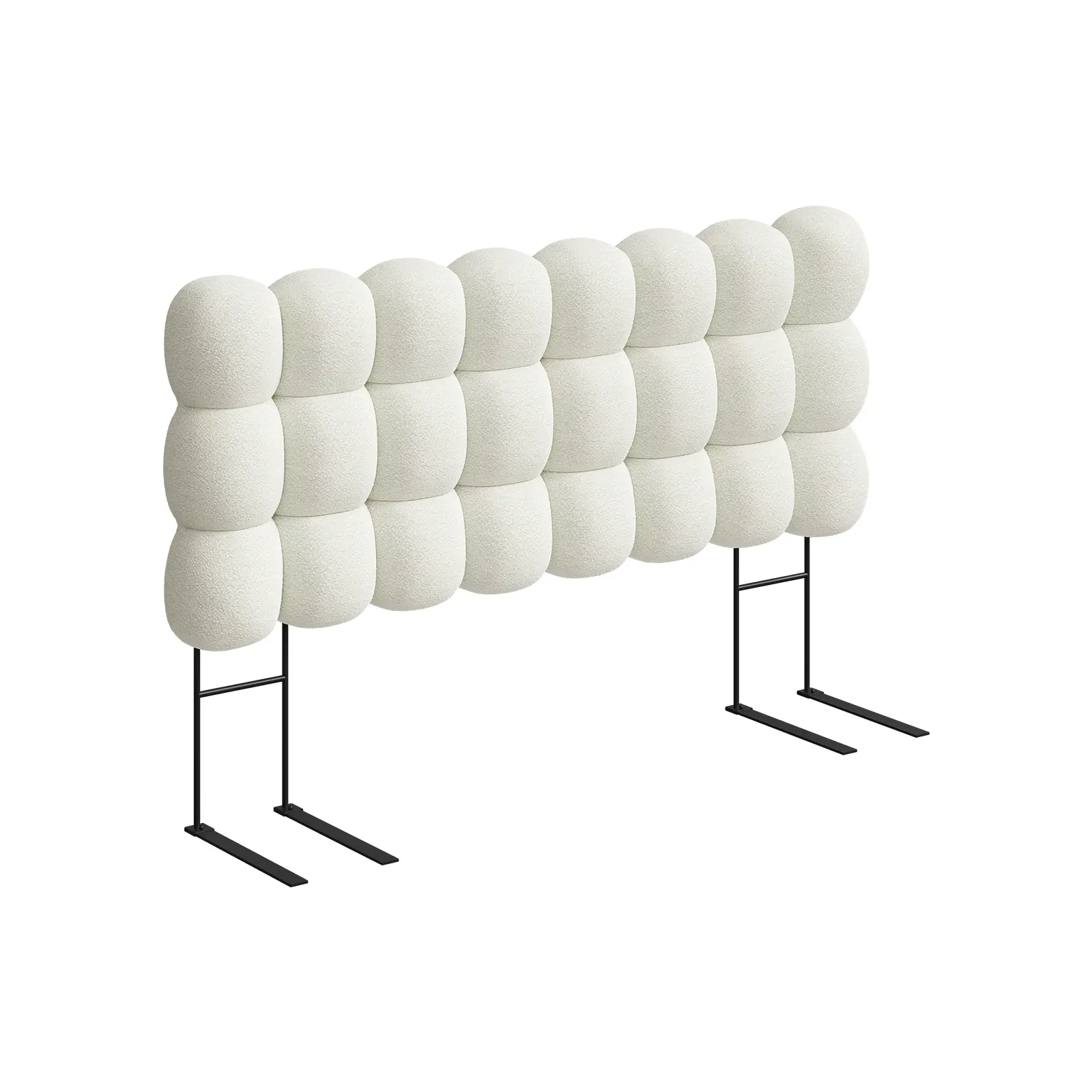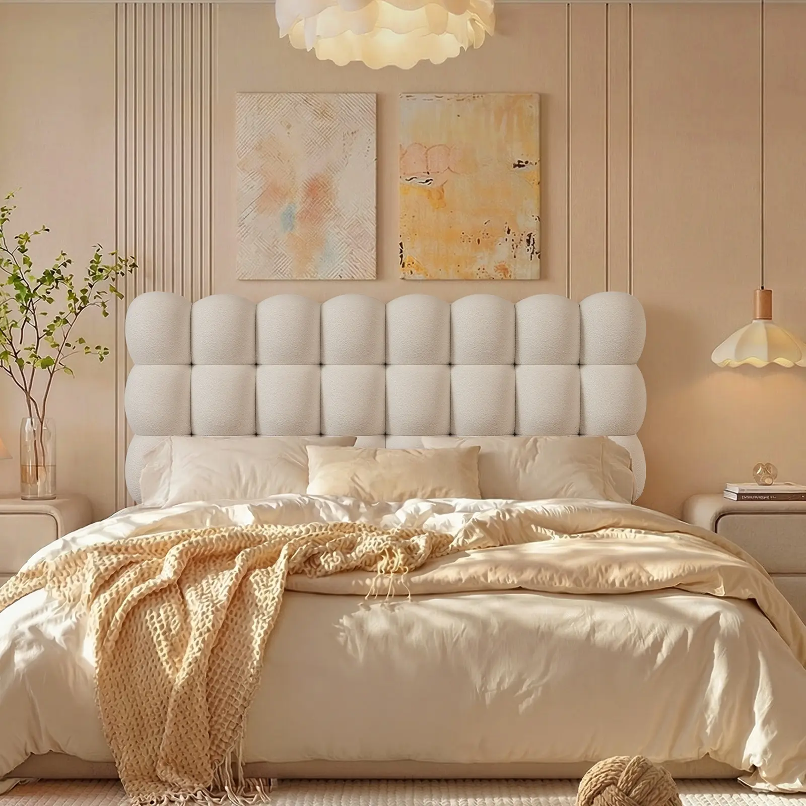 Transform your bedroom into a serene retreat with this cloud-inspired tufted headboard, blending modern design with ergonomic comfort. Each plush, bubble-like pod is filled with high-resilience foam for cloud-like softness and enhanced lumbar support. Upholstered in trendy, skin-friendly teddy fleece, it adds a cozy and elegant touch to modern, minimalist, or boho spaces. The adjustable mounting system ensures a seamless fit for any mattress thickness, stress-free 5-minute assembly, offering a custom-built look and luxurious feel for your any-sized bed.