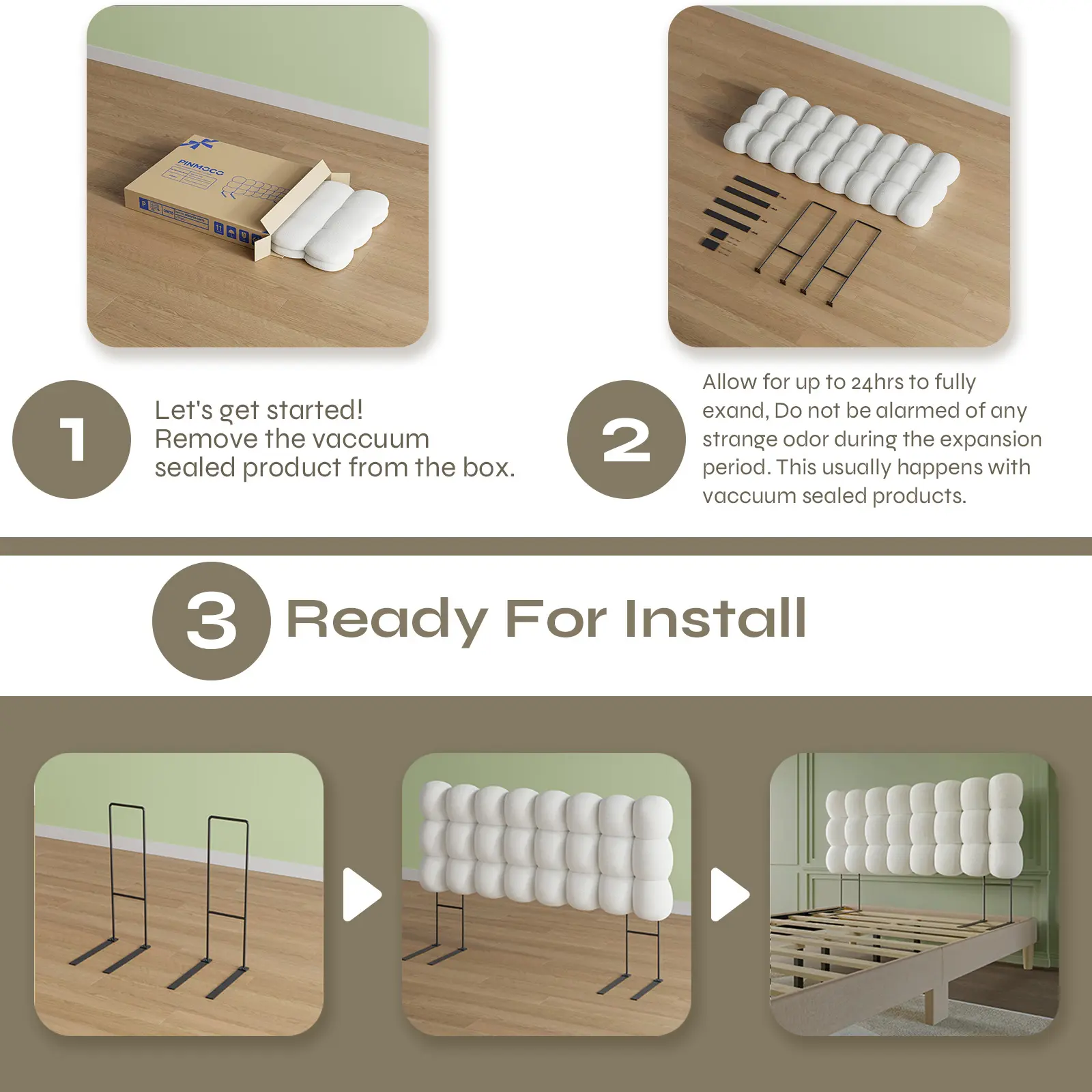 Headboard in One Box: Pinmoco headboard is compressed and packed in a box. You just need to open the vacuum bag and wait for 2-4 hours for the headboard will fully expand and regain its shape.