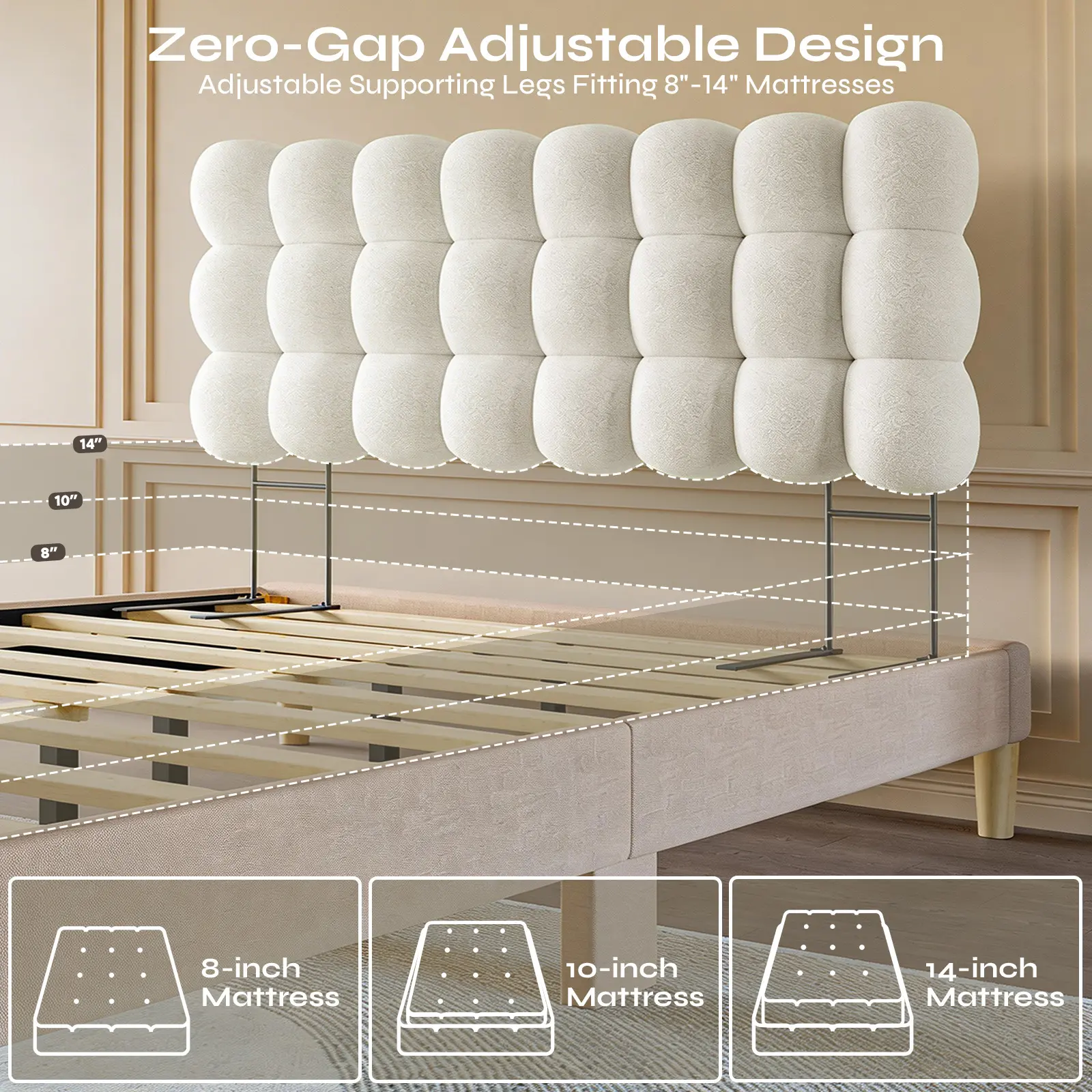 Adjustable Height Headboard: Upholstered headboard features multiple optional heights that can be adjusted, suit for the mattress from 8''-14'', can be placed directly on the mattress, perfectly adapting to different mattress thicknesses and personal preferences.