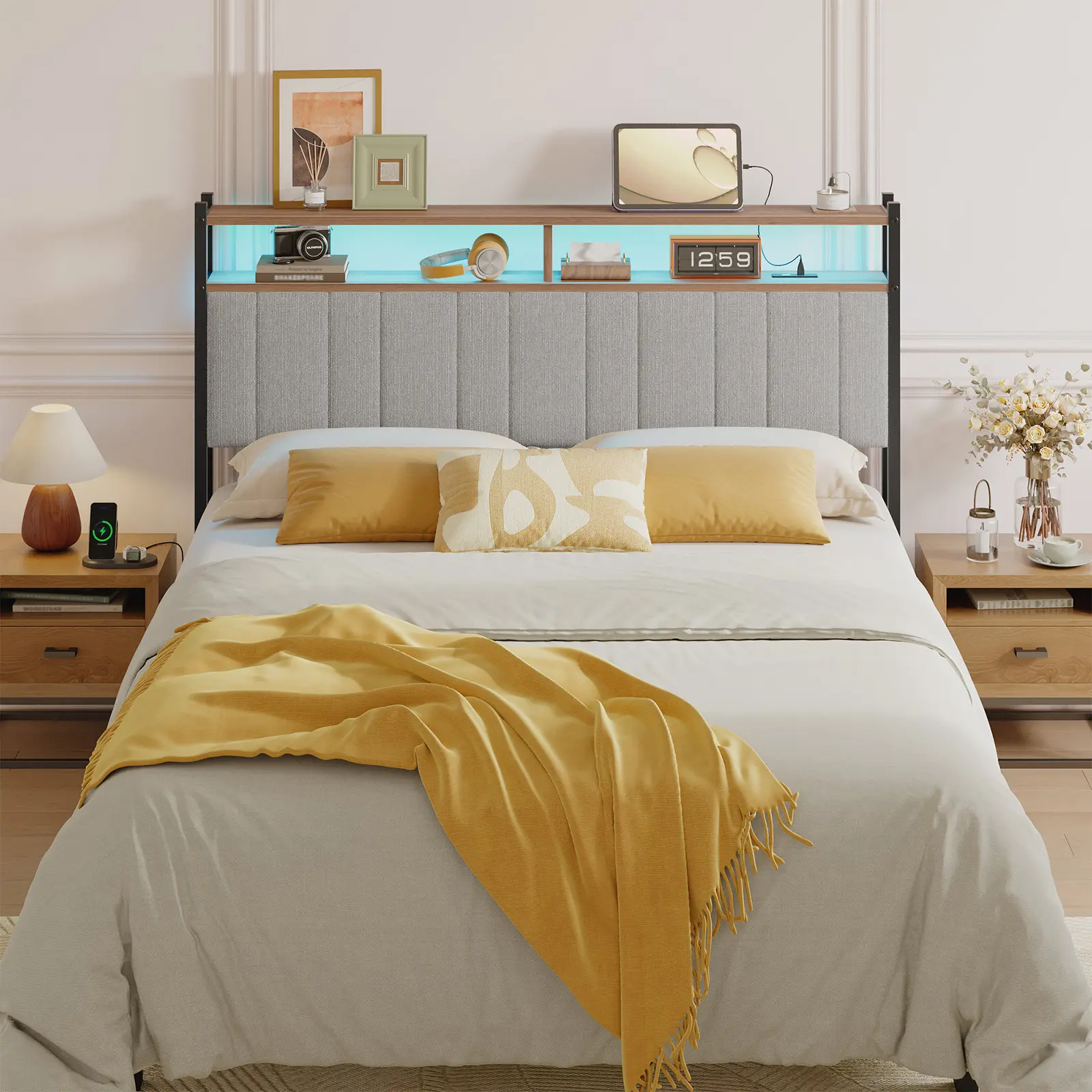 ·Cozy Upholstery and Double-Tier Storage: The linen upholstery of the queen size headboard filled with high elasticity sponge, providing stronger support to effectively relieve fatigue. The breathable nature of the linen upholstered design not only enhances the beauty of the headboard but also improves its usability. Its two open shelves provide ample space for cell phones, glasses, alarm clocks and other items.