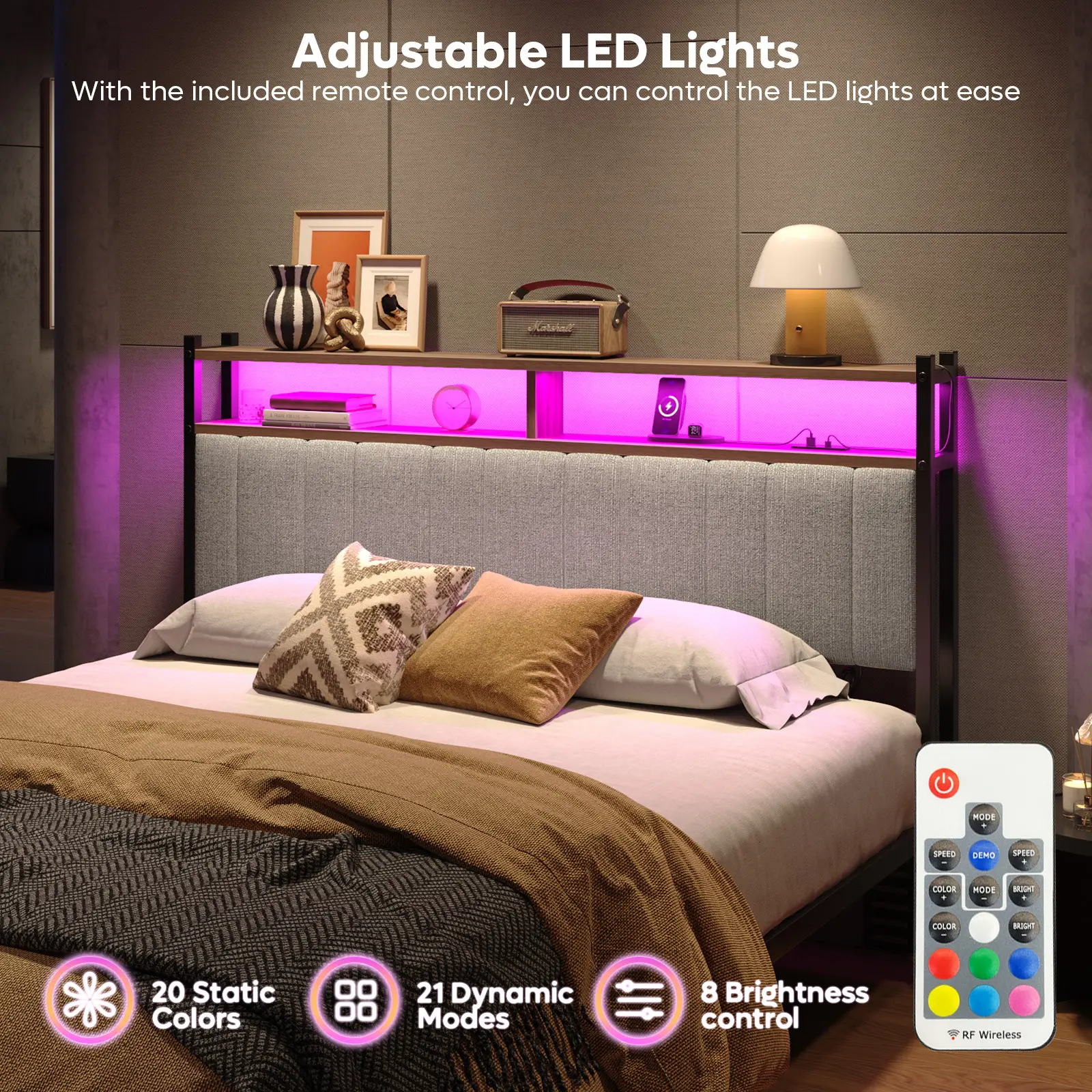 ·Adjustable LED Light with Remote Control: This headboard queen size has an LED strip light that replaces table lamps. It offers 7 colors to choose from, you can create the desired atmosphere for any occasion with the remote control.