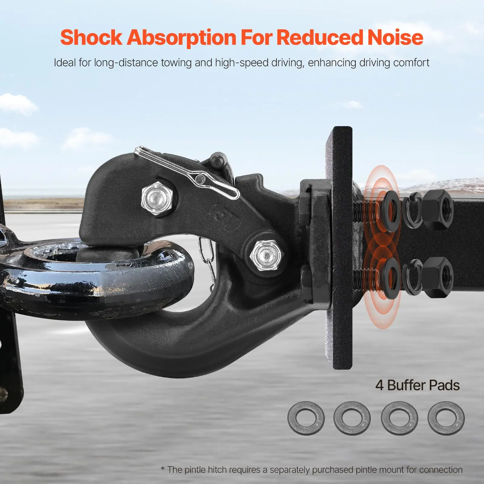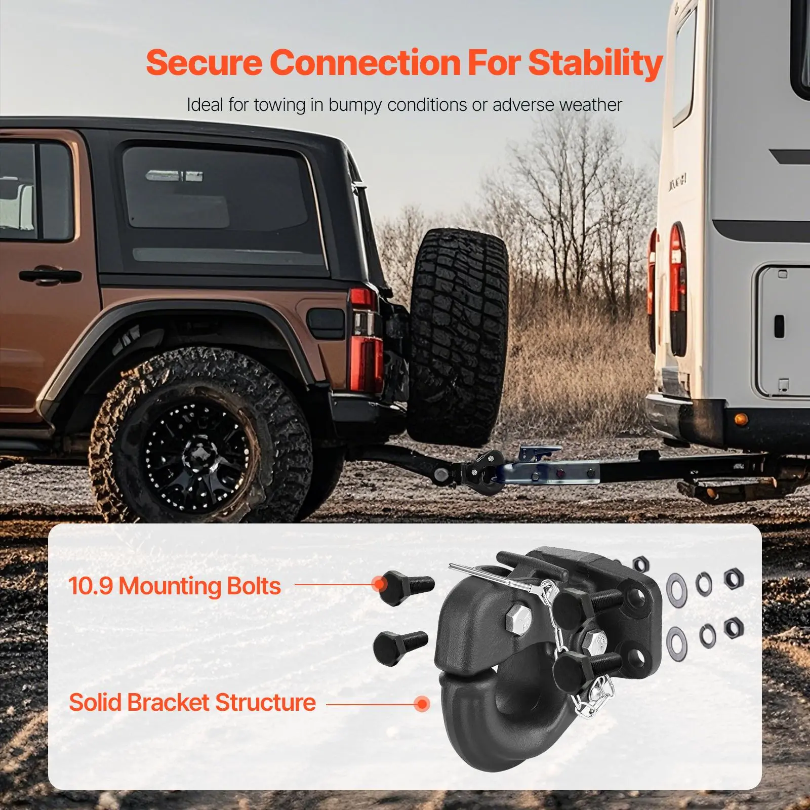 • Secure Connection: Designed with a solid one-piece pintle mount structure and GB10.9 mounting bolts, the pintle hook hitch provides a high-strength and stable connection, reducing security risks. This is especially beneficial for travel in bumpy conditions or adverse weather.
