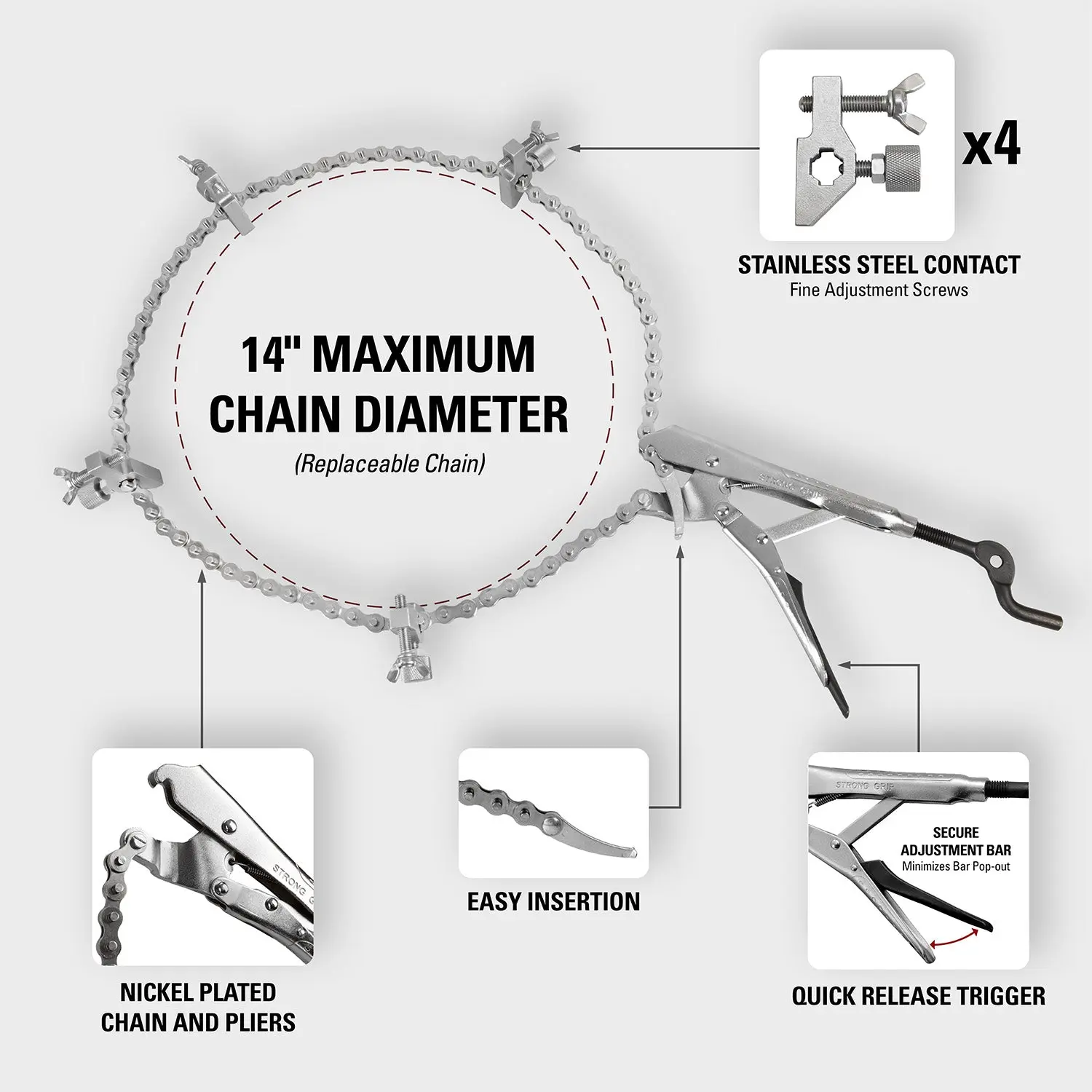 Versatile Fit: The 48” chain is designed to accommodate pipes up to 14” in diameter, providing flexibility for various welding projects.