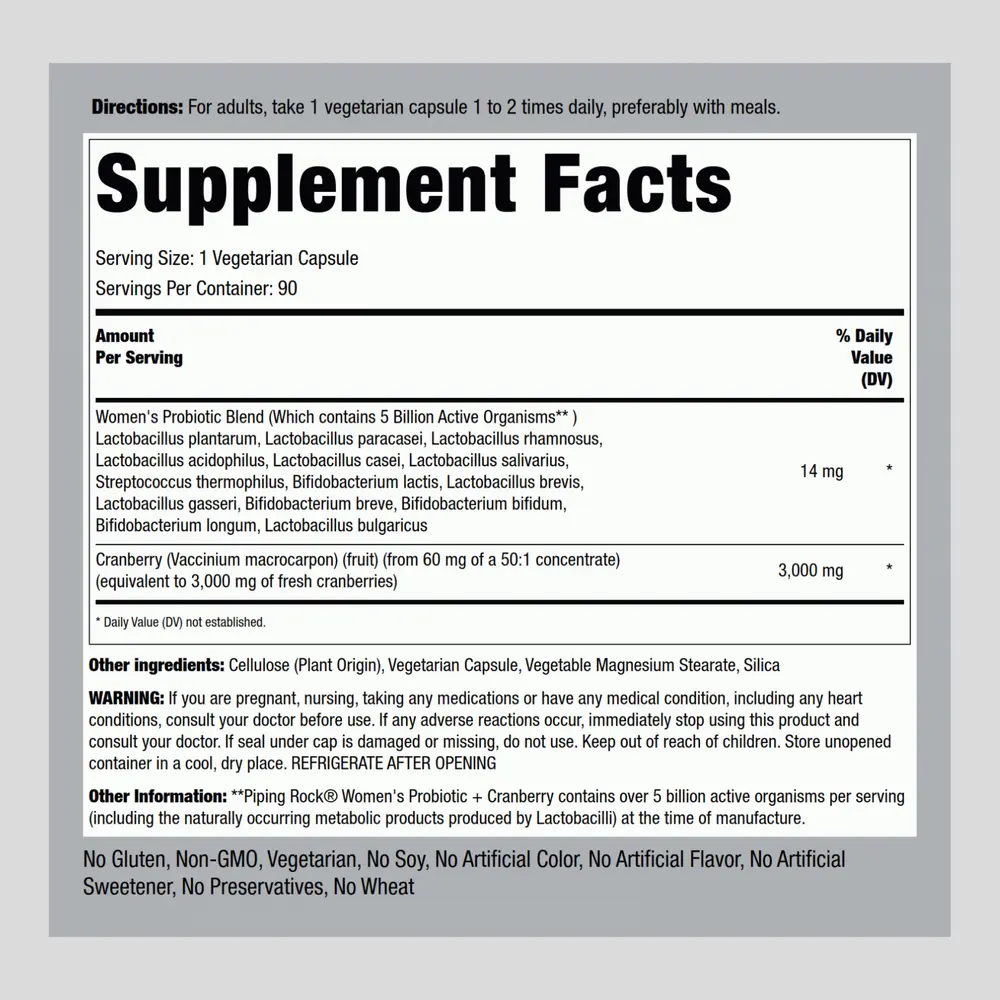 Women’s urinary tracts and guts have special needs. Piping Rock caters to those needs with our extra strength Probiotic with Cranberry supplement. Each serving contains our Women’s Probiotic Blend which has specific strains of active organisms specially curated for the female gut. We’ve also added in the equivalent of 3,000 mg of cranberry for its added benefits for women. Grab a bottle to renew your health routine, and enjoy these vegetarian-friendly capsules today!