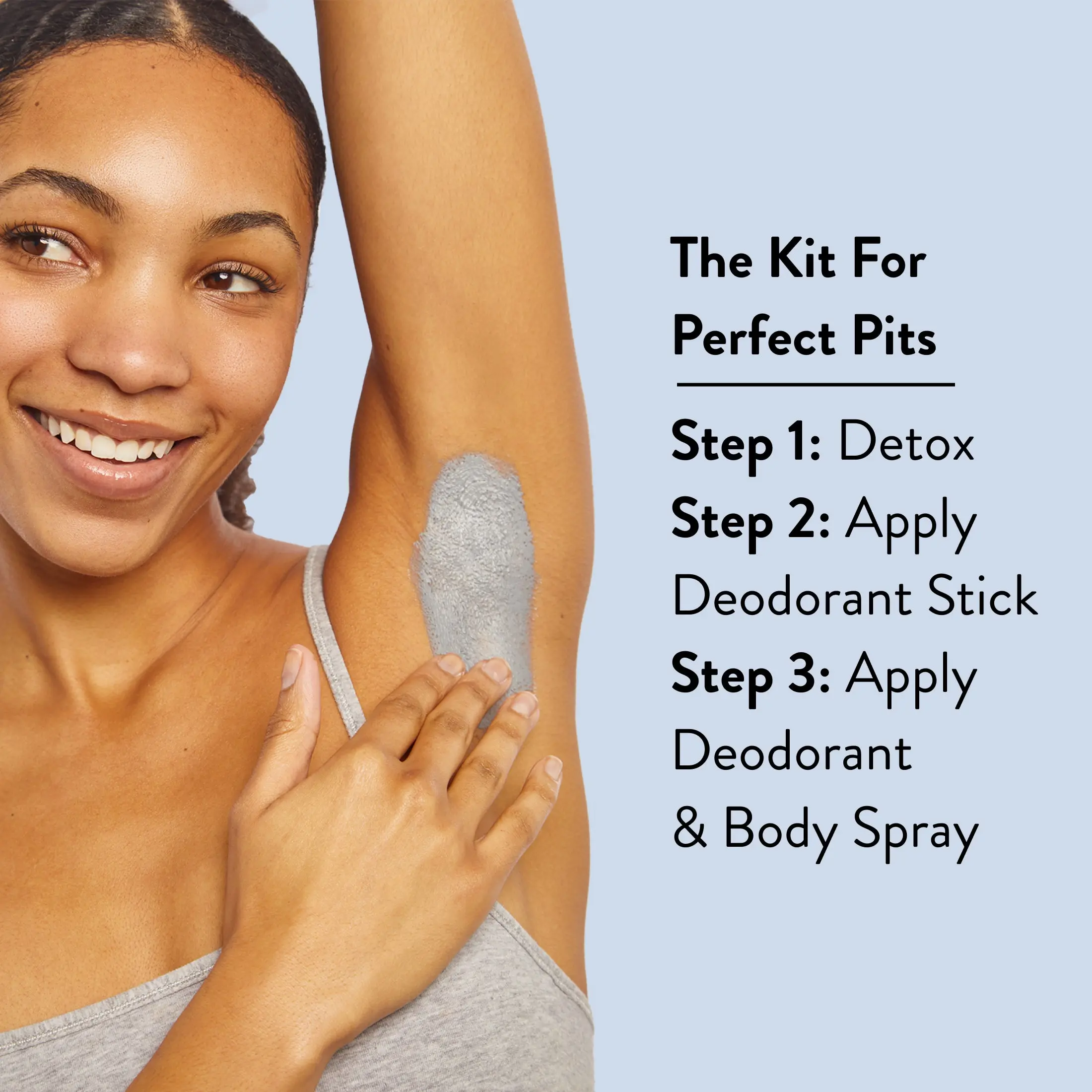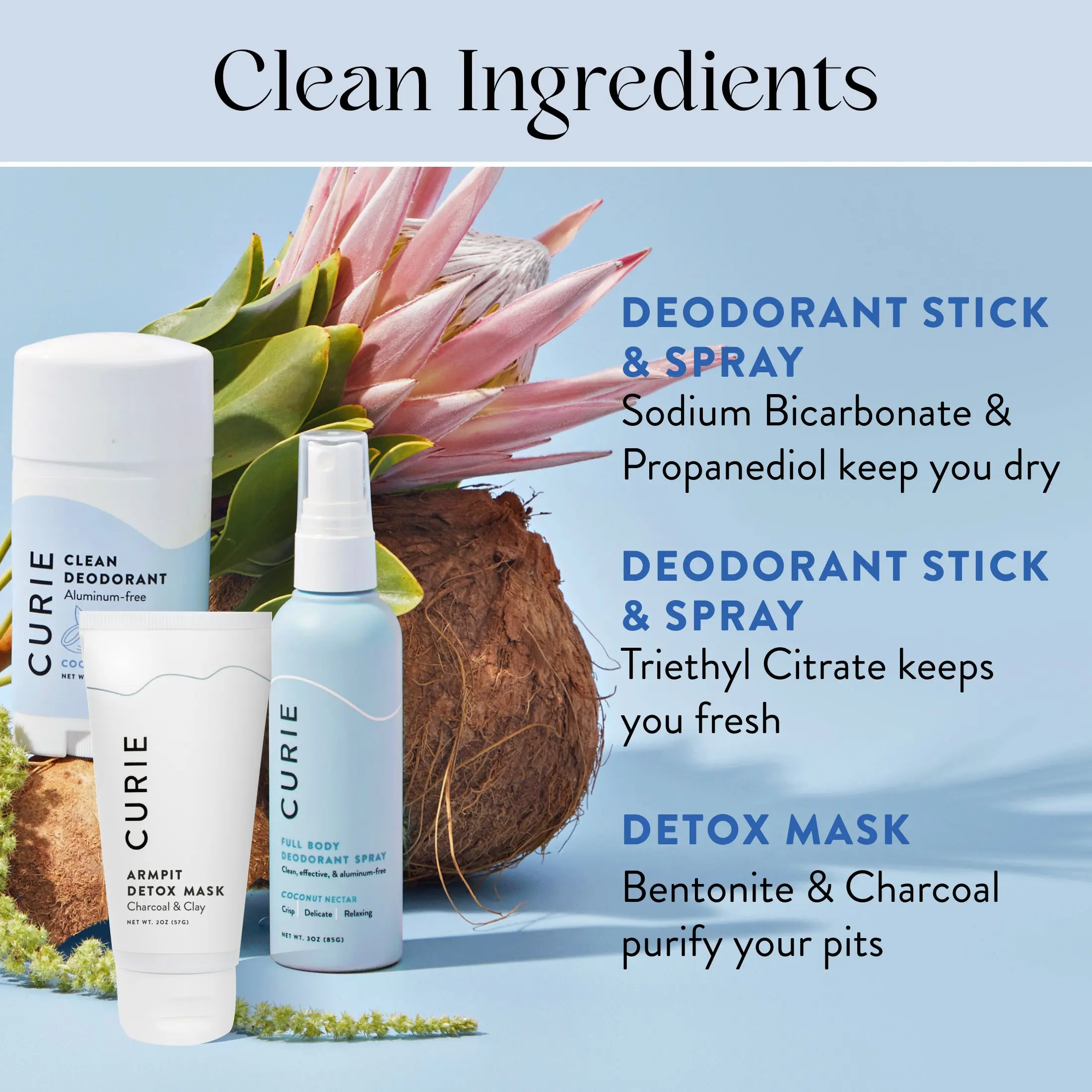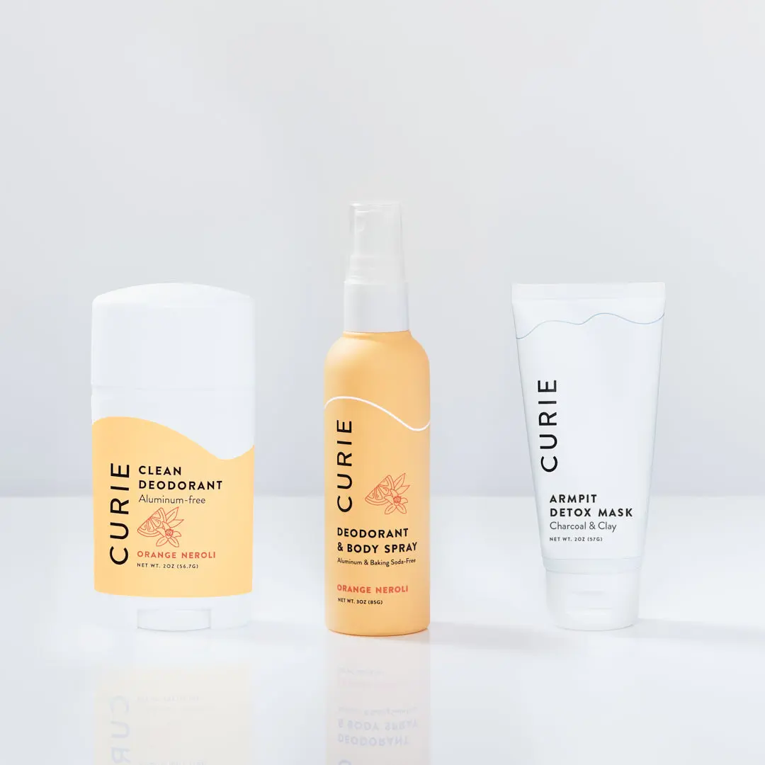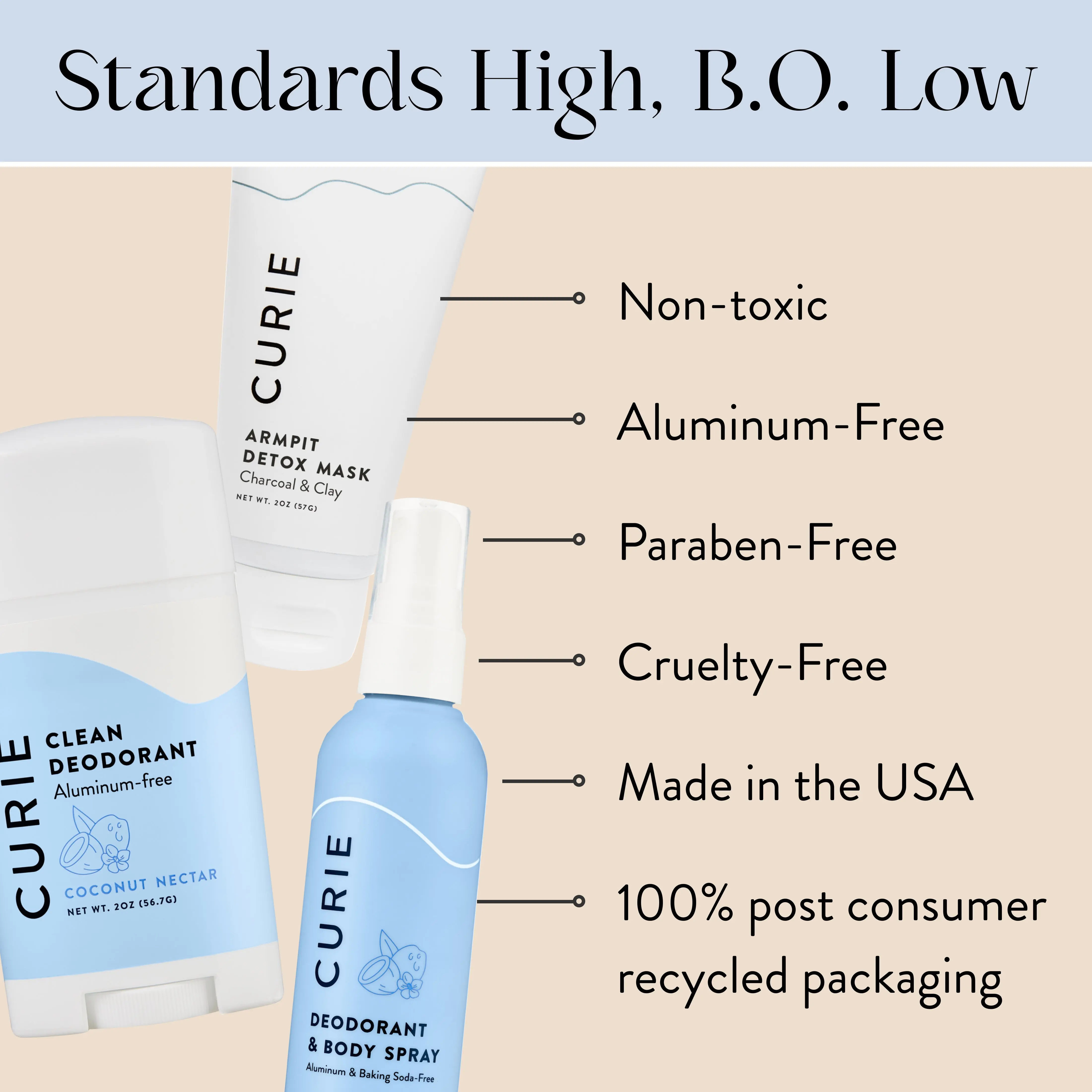 Switching to aluminum-free deodorant just got easier with Curie’s Pit Kit, featuring our best-selling Armpit Detox Mask, Clean Deodorant Stick, and Clean Deodorant & Body Spray. This powerful combo helps detoxify your pits to help keep you smelling (and feeling) fresh from head to toe!