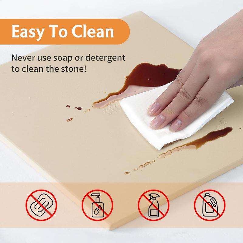 ·Clean: Just scrape off any excess food with a spatula before you start cleaning. Once your stone has cooled down, give it a quick rinse under warm water while you give it a little scrub with your brush. Just a heads-up: never use soap or detergent on a stone. Stains are totally normal! They're from the oils, cheese, crusts and baked goods that it's created. No worries, though – these marks won't affect the stone's performance or function. In fact, many cooks even prefer a stone that's been used for a while!