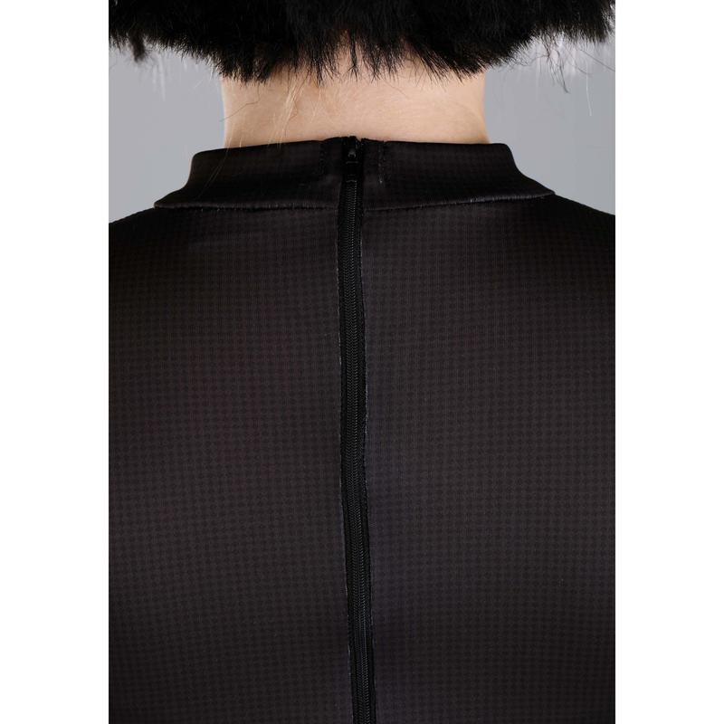 · Shiny jersey knit jumpsuit with foam backed black fabric, zipper down center back
