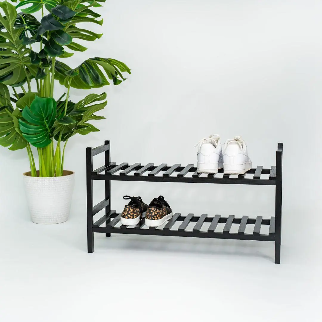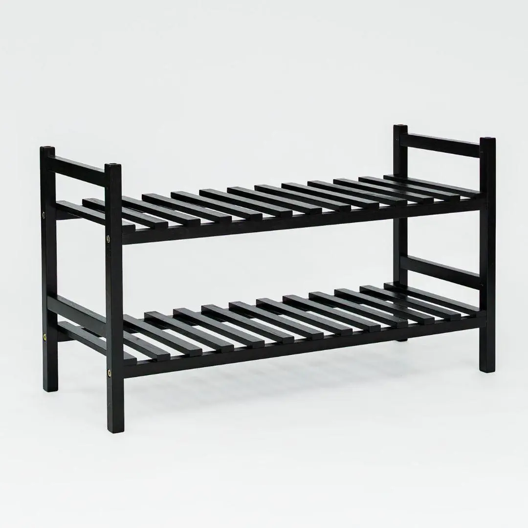 Stackable wood shoe rack for closet and entryway organization holds up to 6 pairs of shoes