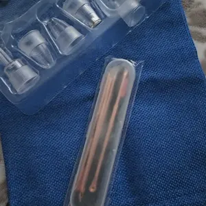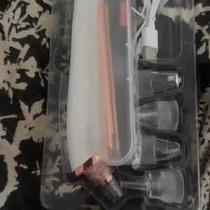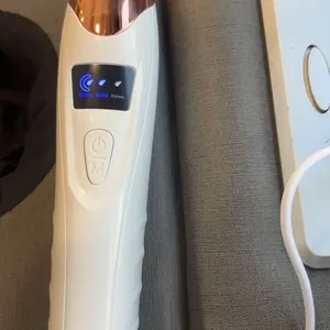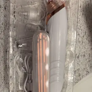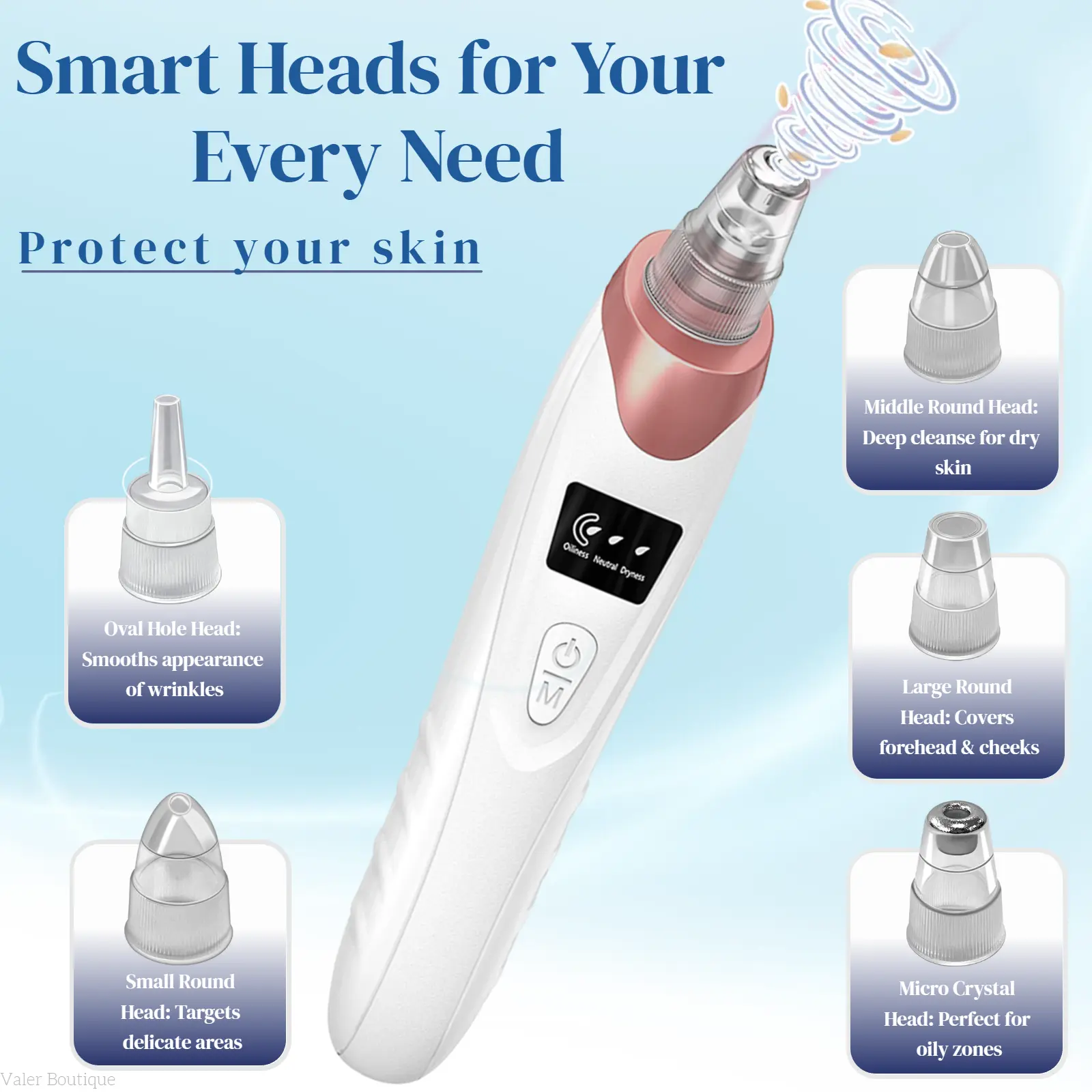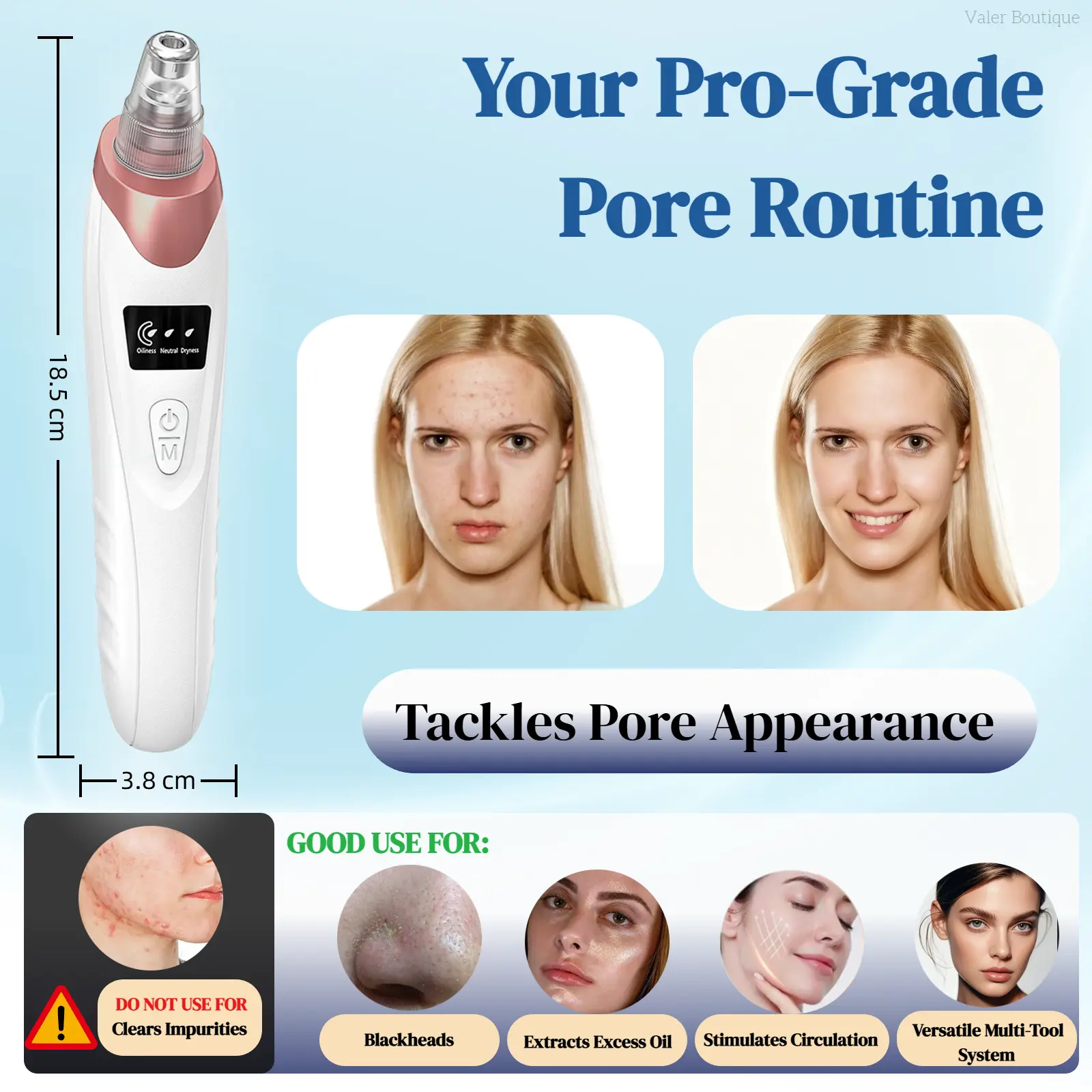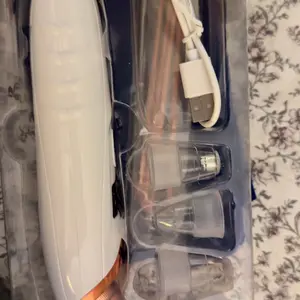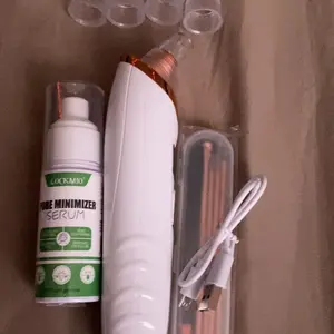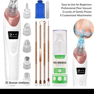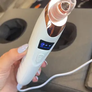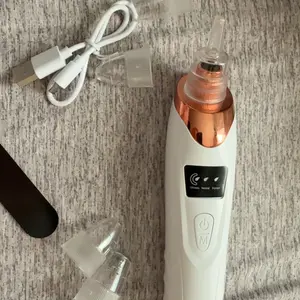 Muy buen producto Este aparato es un limpiador facial por succión, comúnmente usado para remover puntos negros, exceso de grasa y suciedad de los poros. El diseño que muestras combina un cuerpo blanco con detalles metálicos en color cobre y una pantalla digital azul que indica modos como Oiliness, Neutral y Dryness, lo cual sugiere que puede ajustar la potencia según el tipo de piel.
