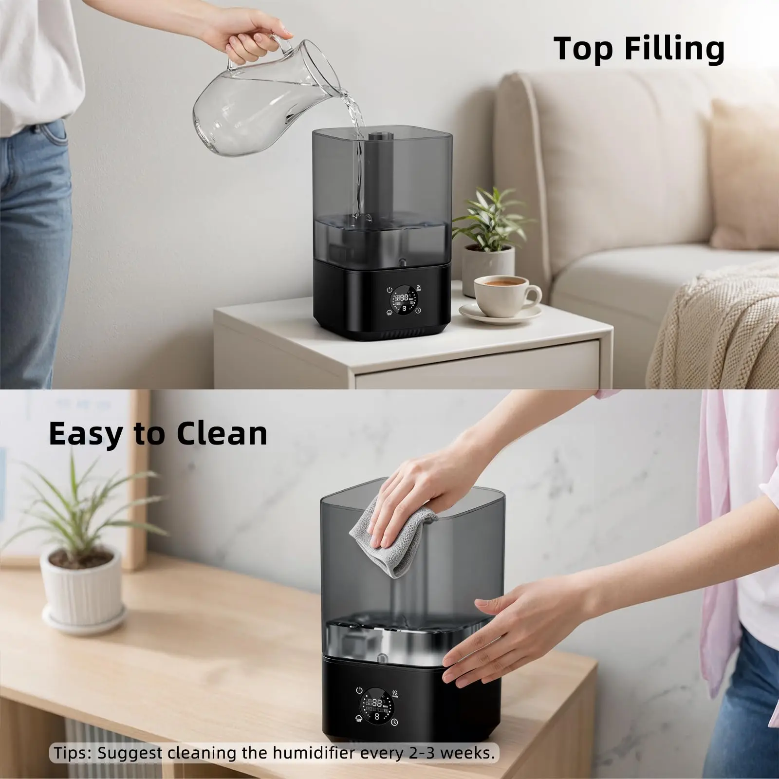 Features a convenient top-fill design for easy refilling. The detachable water tank with a wide opening allows simple cleaning. Regular cleaning every 2–3 weeks is recommended for optimal performance.