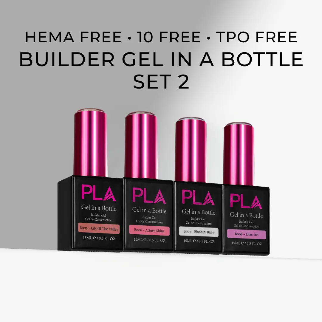 PLA’s Builder Gel in a Bottle 4 Packs have 4 dreamy shades with a low heat spike formula, available in 3 different color variations. Perfect for creating overlays, structured manicures or reinforcing natural nails, these gels offer strength.