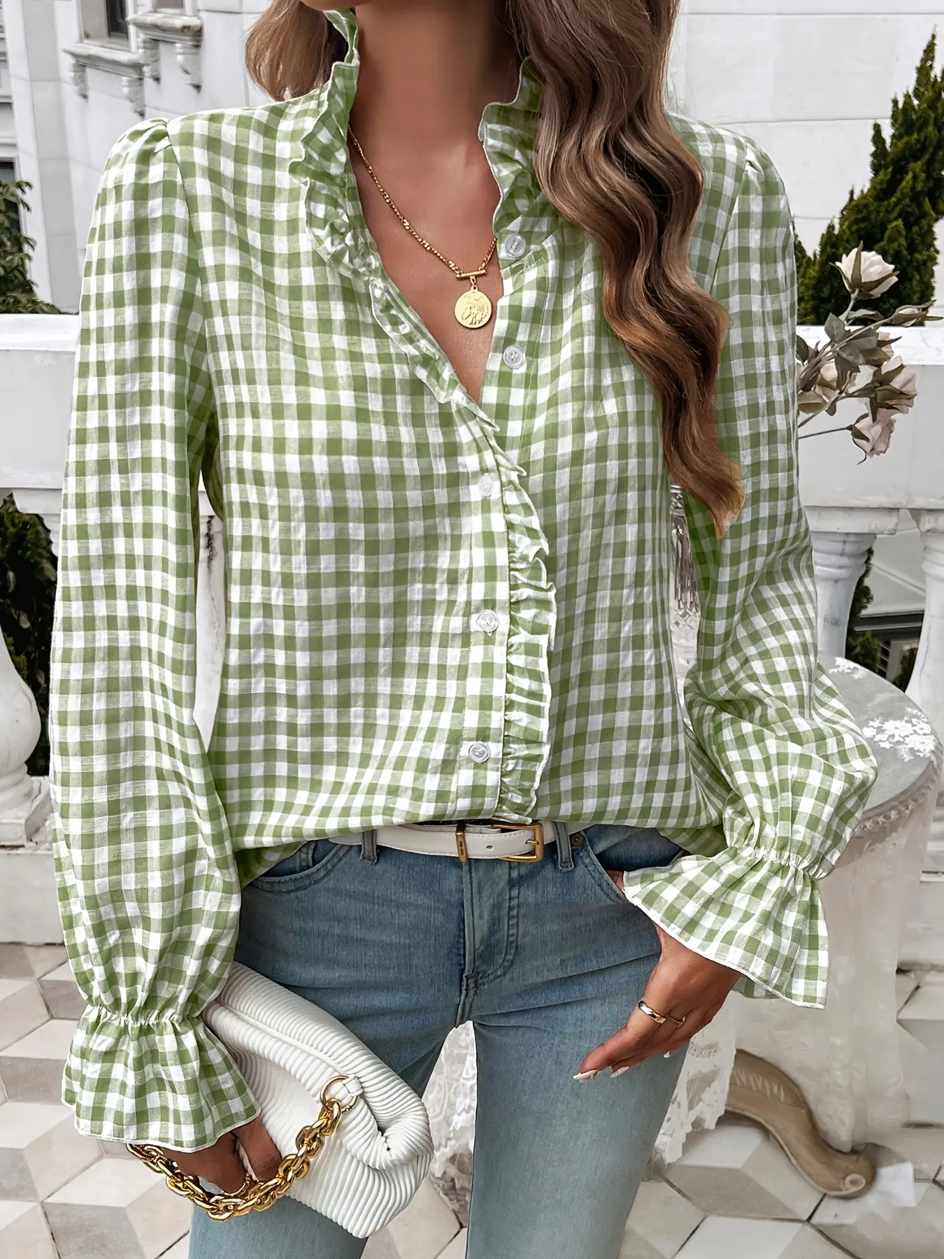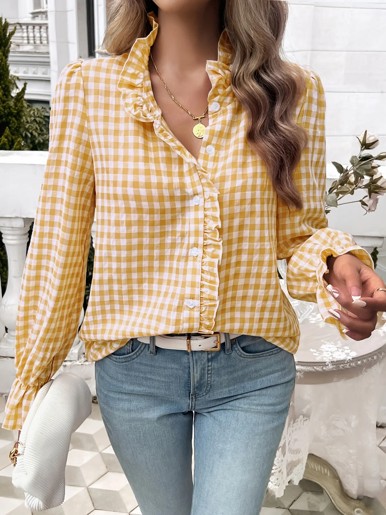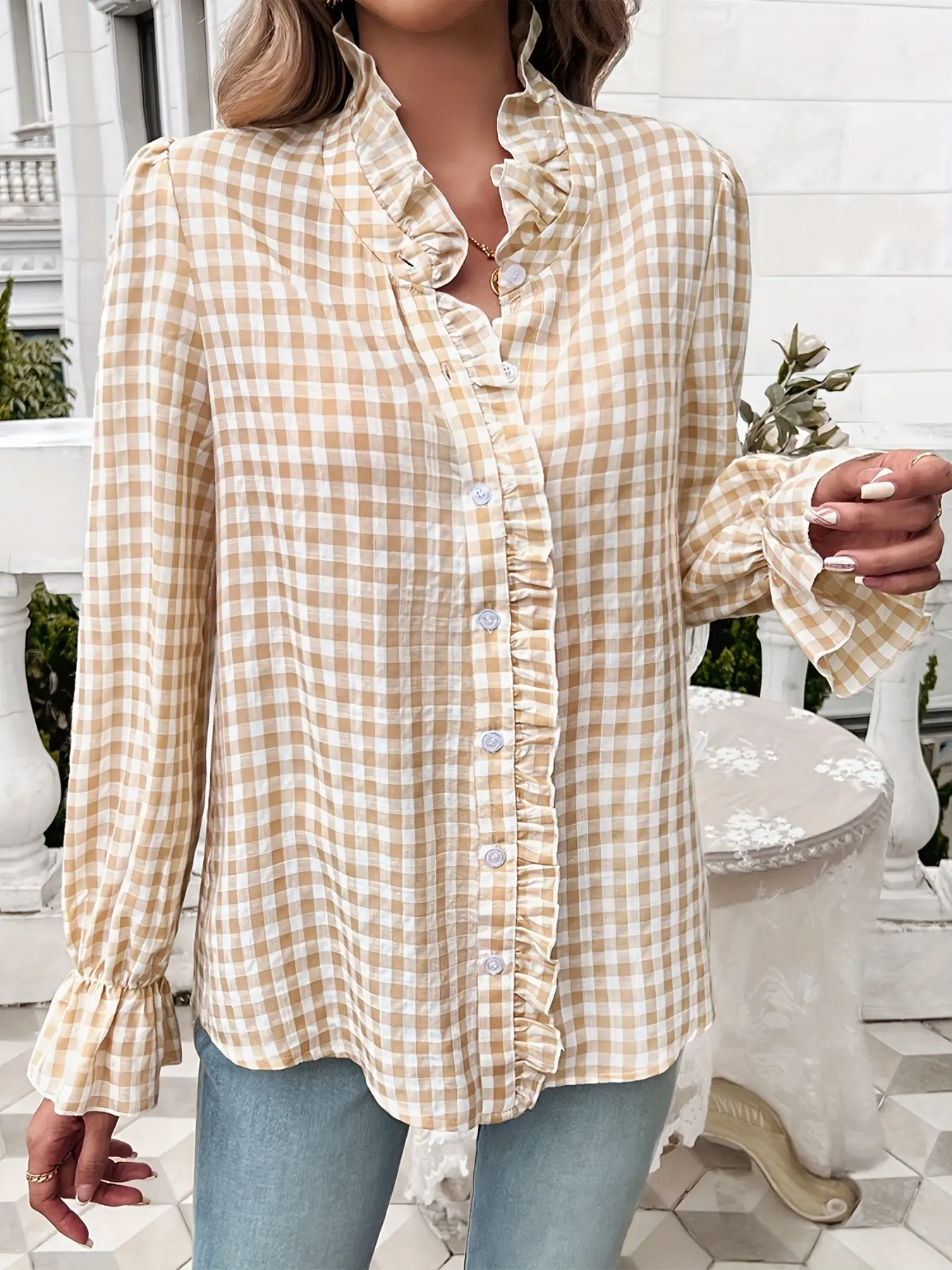 ·The shirt's design enhances its appeal with long sleeves and ruffle detail.