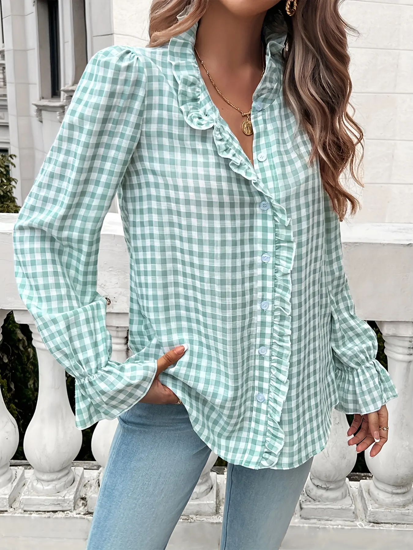 ·This ZAFUL Women's shirt features a light blue and white plaid pattern.