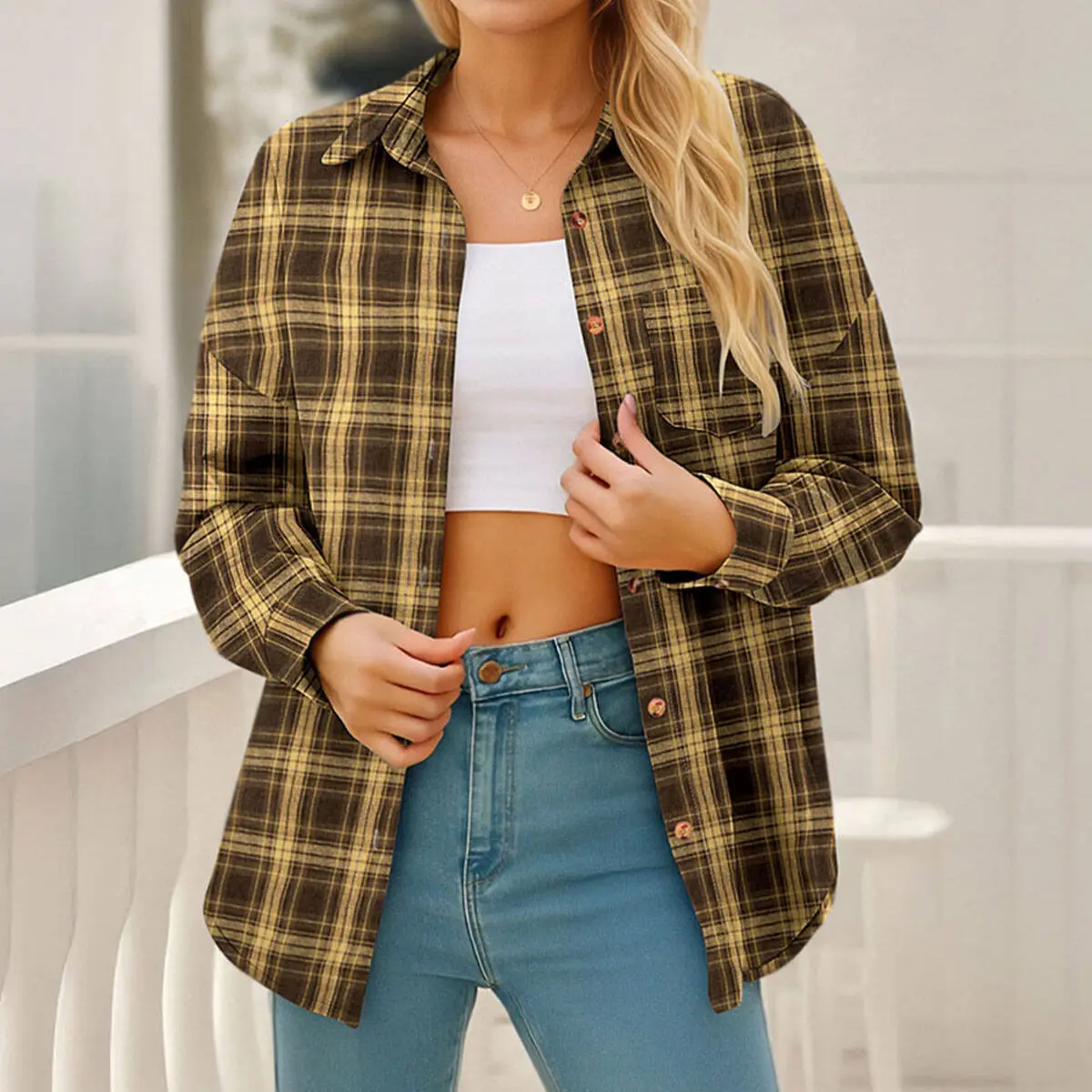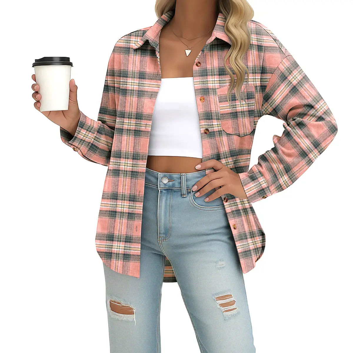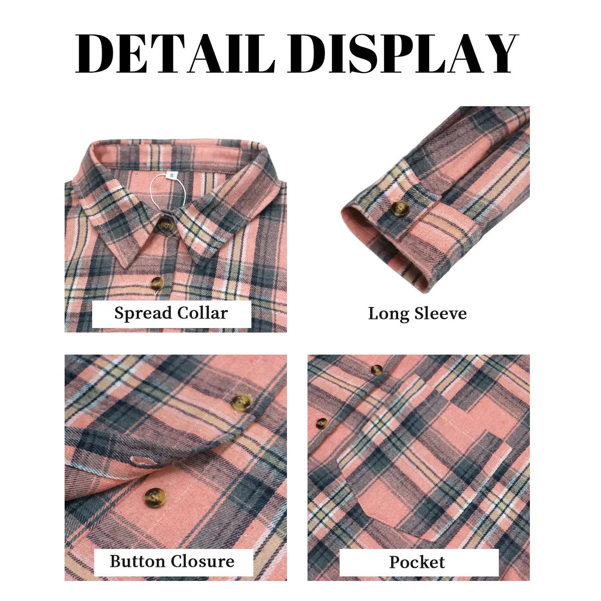·Features:This women's long-sleeve flannel plaid shirt is crafted from a premium blend of 50% Cotton+50% Polyester, offering a medium-lightweight fabric that’s both breathable and comfortable. Combining the softness and skin-friendly feel of cotton with easy care, it’s perfect to wear alone or layer during early autumn. The classic plaid pattern adds a timeless rustic charm that effortlessly enhances any outfit’s style.