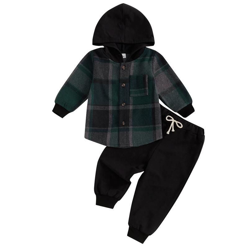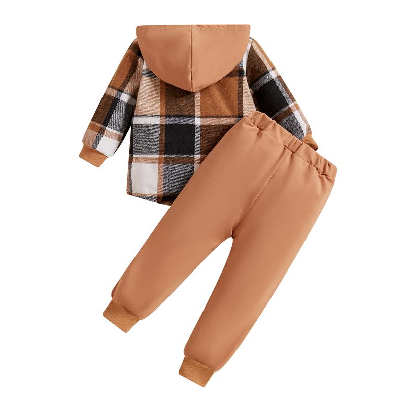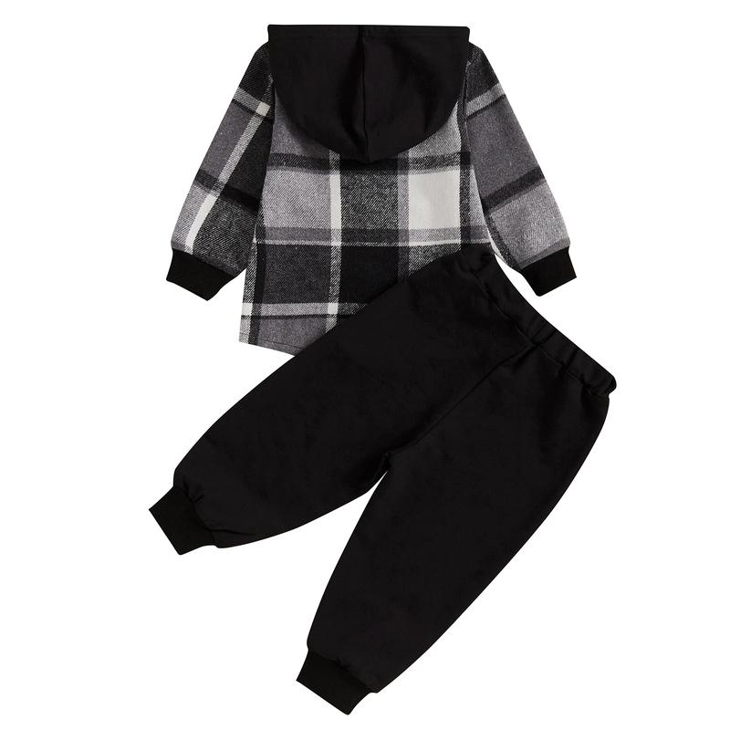 Baby Boys Outfit, Long Sleeve Hooded Plaid Jacket with Elastic Waist Pants Infant Clothes