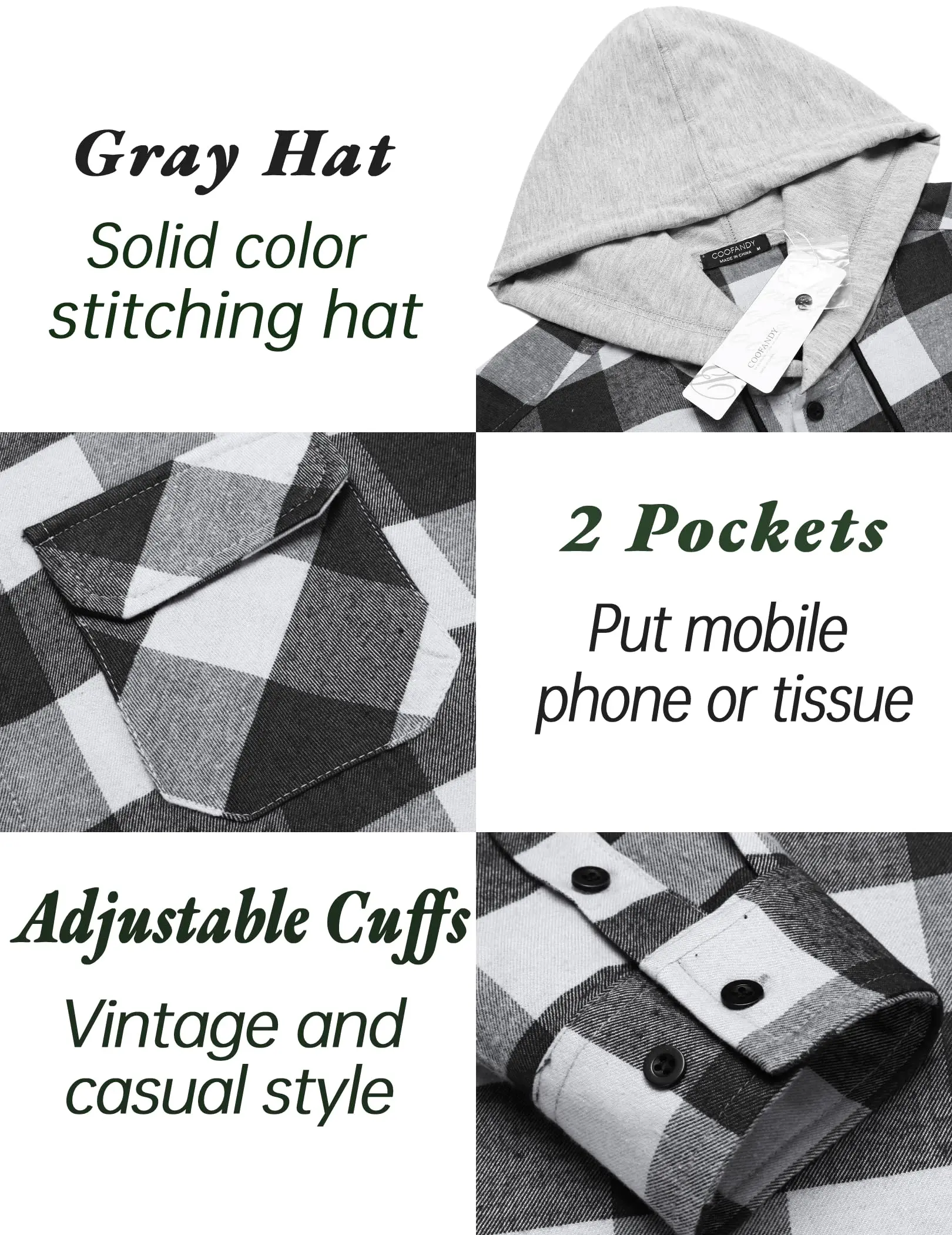 ·Mens Plaid Hoodie: Mens regular-fit plaid flannel shirts is 2 pockets design, featured with long sleeve, hooded design, adjustable cuff, 7 buttons closure for a tailored look. COOFANDY men's fall shirts, vintage fashion plaid color design can make you exude endless mature men's charm without lack of vitality. Mens long sleeve button down shirts can be seen in both formal and casual settings, reflecting not only a style of dress but also a lifestyle attitude and cultural symbol