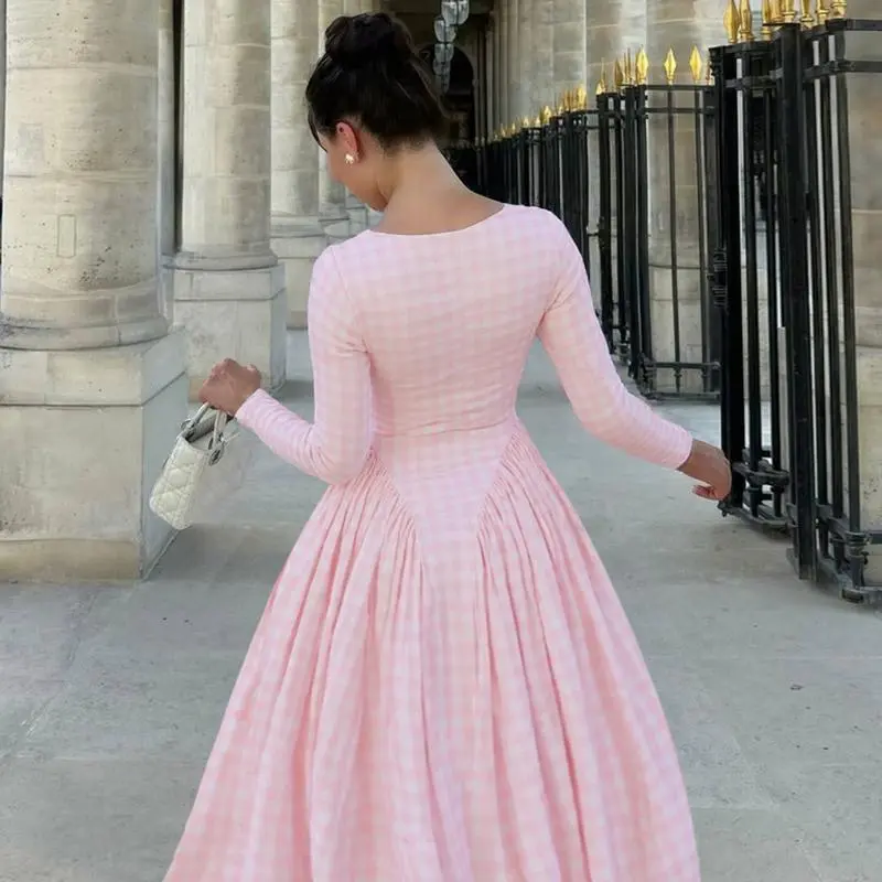 Plaid Print Square Neck Long Sleeve A-Line Midi Dress with Pleated Waist Women's 2025 Fall New Casual Elegant Dress Party Night Club Dating Holiday Vacation Outfit Dress
