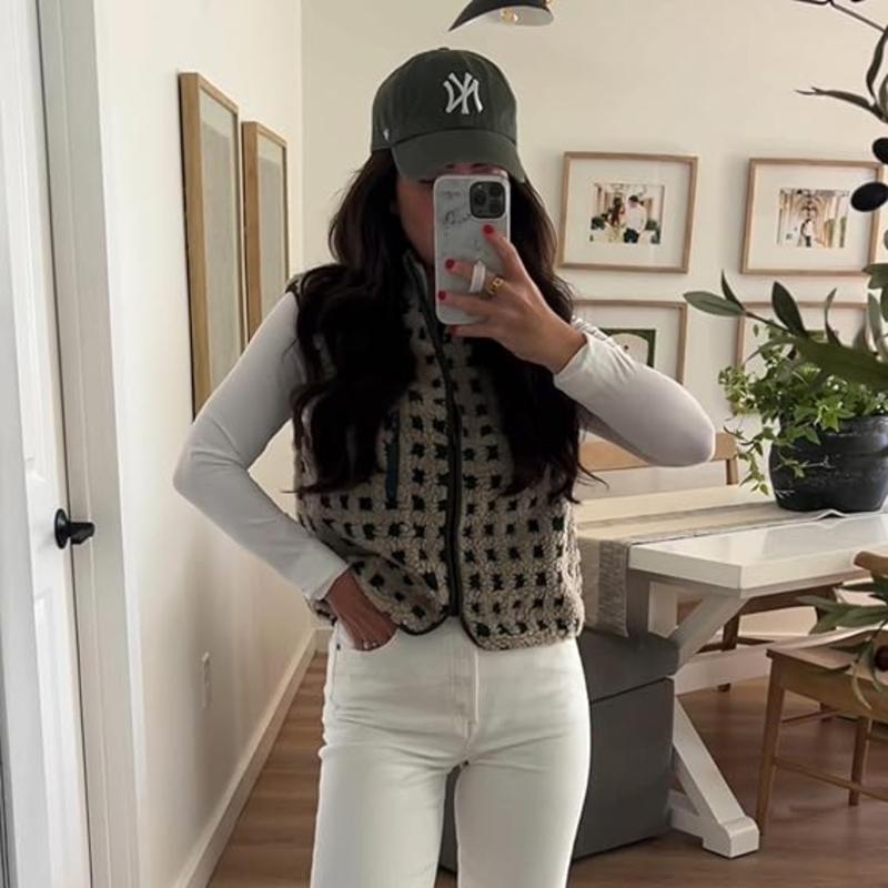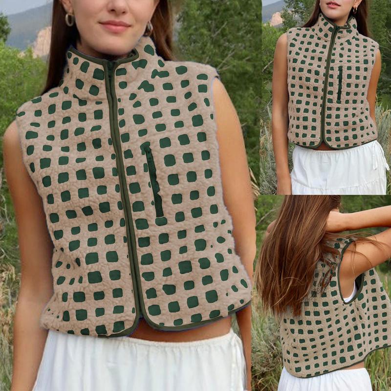 Feature: Trendy fleece vest for women, women plaid sherpa vest, sleeveless, high collar, chest pockets, loose fit, oversize, zip up, winter jacket
