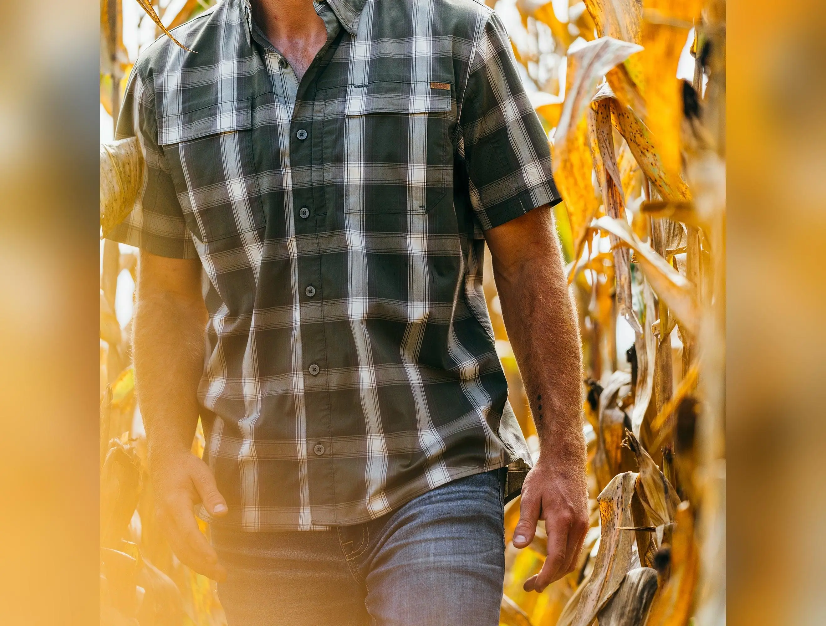 The Haybaler Short Sleeve Plaid shirt elevates the iconic cape-back work shirt. This farm shirt is designed for long days tackling any jobs that comes at you. Between it's sun protection, mobility, and breathability qualities, it's the perfect tool for the farm. UPF30 sun protection Mesh Cape back Laser perforated under arms Extreme durability Moisture resistance Stain resistance Hidden zipper cellphone pocket Pen holder Hidden velcro double chest pockets Sunglass cleaner Hidden buttons under collar Anti-viral Anti-fungal Anti-bacterial Easy care Non-Leaching Interior Locker Loop Product Composition: 75% Polyester, 23% Cotton, 2% Spandex Style: A1500007