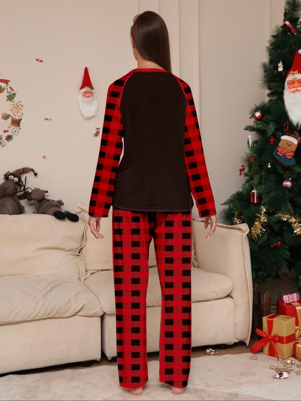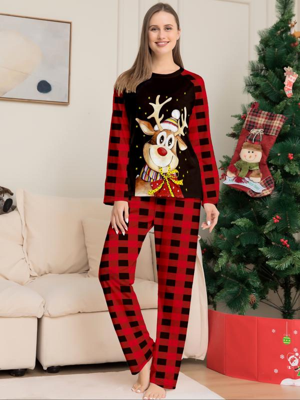 Plaid Shoulder Pad Sleeves 'cute Reindeer' Parent-Child Pajama Set, Family Matching Color Block Pattern, Festive Christmas Wear