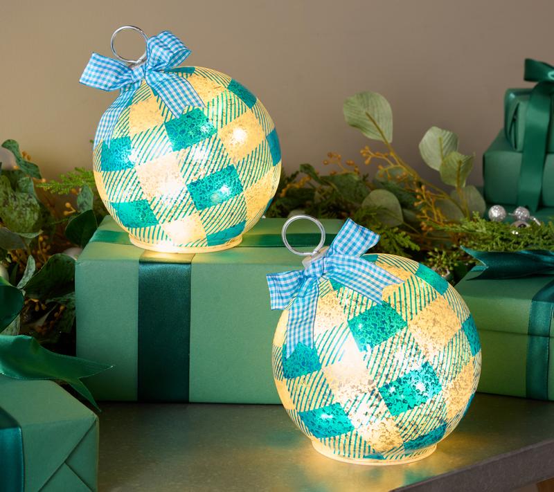 Merry and bright, these illuminated plaid ornaments make a festive focal point on your tabletop. The mercury glass design glows from within to add light -- and delight -- to your decor. From the Valerie Parr Hill Collection.