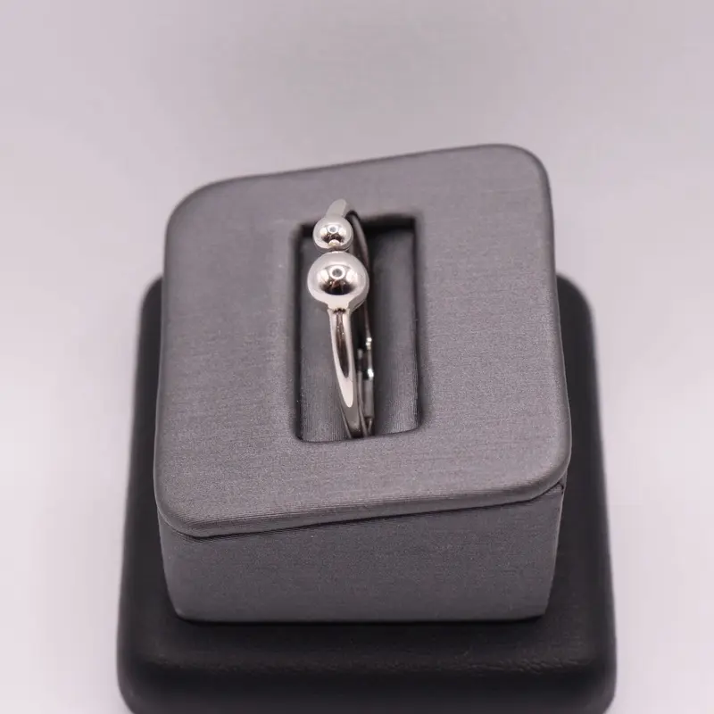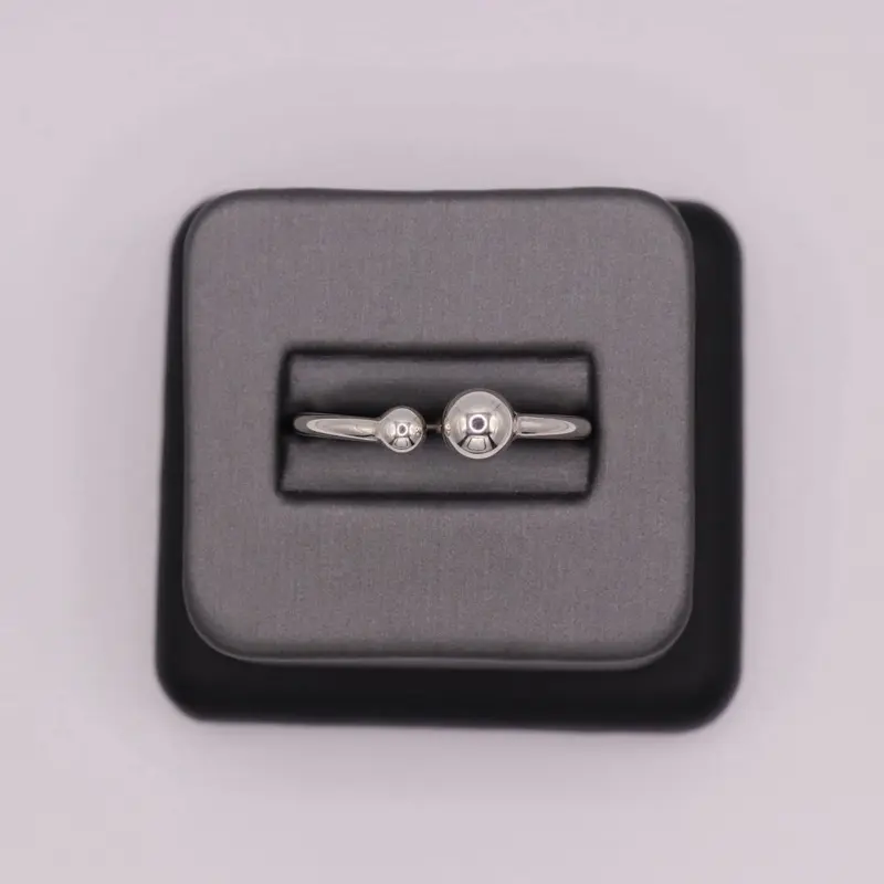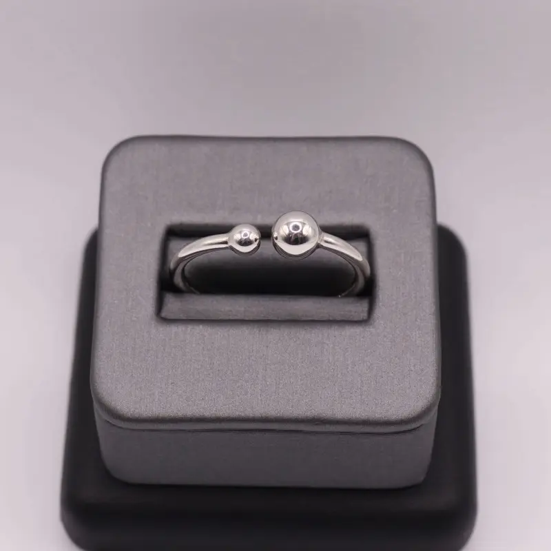Anillo moderno abierto en plata 925 con dos esferas pulidas de diferentes tamaños. Su diseño minimalista simboliza equilibrio y armonía. Ajustable para un ajuste cómodo y perfecto para uso diario.