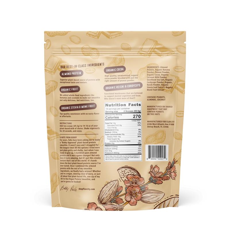 Ditch your blender and try my dairy-free All-In-One Vegan Protein Smoothie with 20g of protein. Just scoop into your favorite bottle with your plant-based milk of choice and shake. We used real peanut powder, organic cocoa, and organic fruit and coconut to make this vegan smoothie not only delicious, but nutritious, too. Instead of stocking your kitchen with protein powder, nut butters, fruit, and more—now you can get it all in one simple serving!