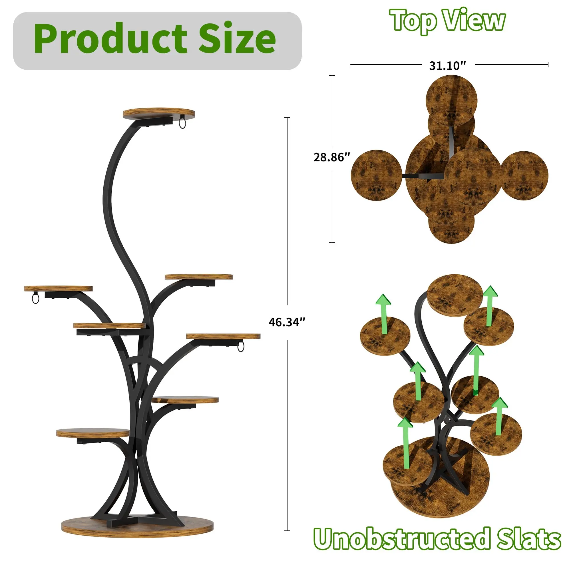 ·【8-Tier, 46.3" Tall Plant Stands】Our design provides an optimal environment for healthy plant growth. Different from other plant shelves that show plants on a vertical line, this plant stand spread the boards to different direction and height, ensuring no layer blocks another, allowing each plant ample space and light to thrive. Perfect for showcasing your plants without obstruction, it transforms any corner into an eye-catching display.