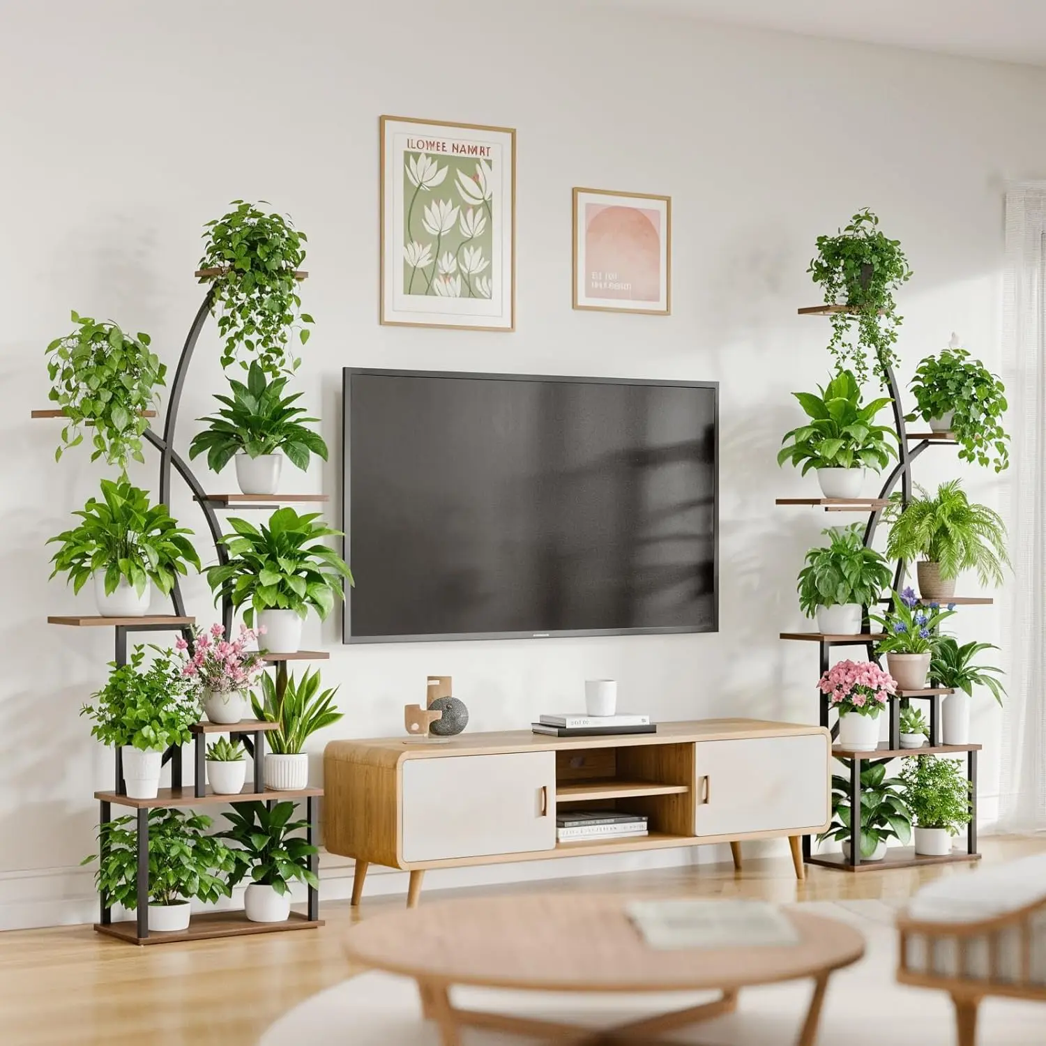 ·【Stable and Durable Plant Shelf】 Crafted for stability, our plant shelf boasts a unique intersecting curved design that minimizes wobbling. Built with thickened iron pipes and sturdy particleboards, it offers exceptional strength and a high load-bearing capacity. Rust-resistant baking paint protects the iron pipes, while waterproof coatings on the particleboards prevent water damage, ensuring hassle-free maintenance.