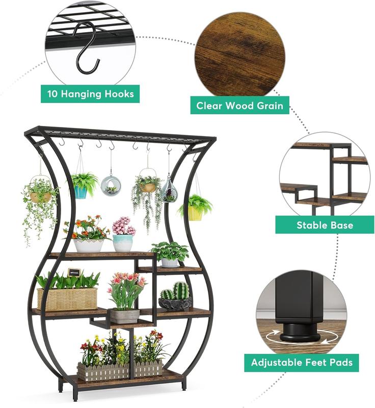 LARGE CAPACITY FOR PLANTS: Adopting a ladder structure, this plant stand features 6 shelves, 7 potted stands, and 10 hanging hooks, offering ample space for your plants, flowers, and pots. The well-spaced design ensures that your plants won't obstruct each other, allowing every plant to receive the maximum amount of sunlight possible.