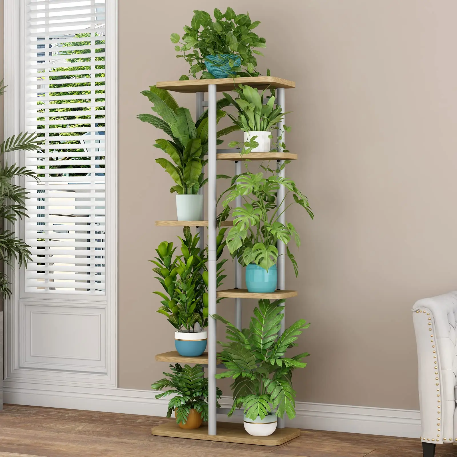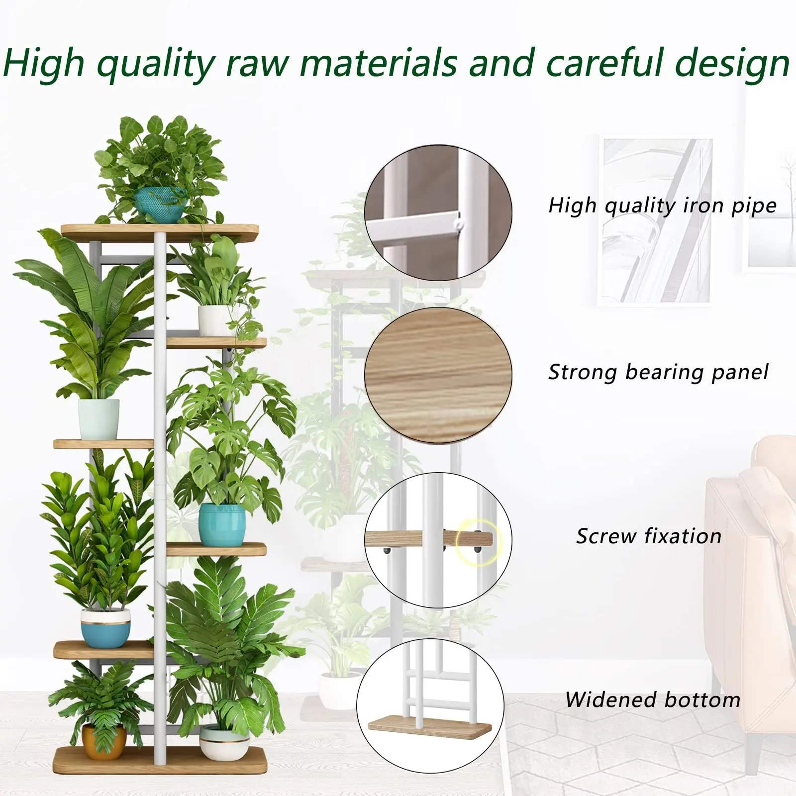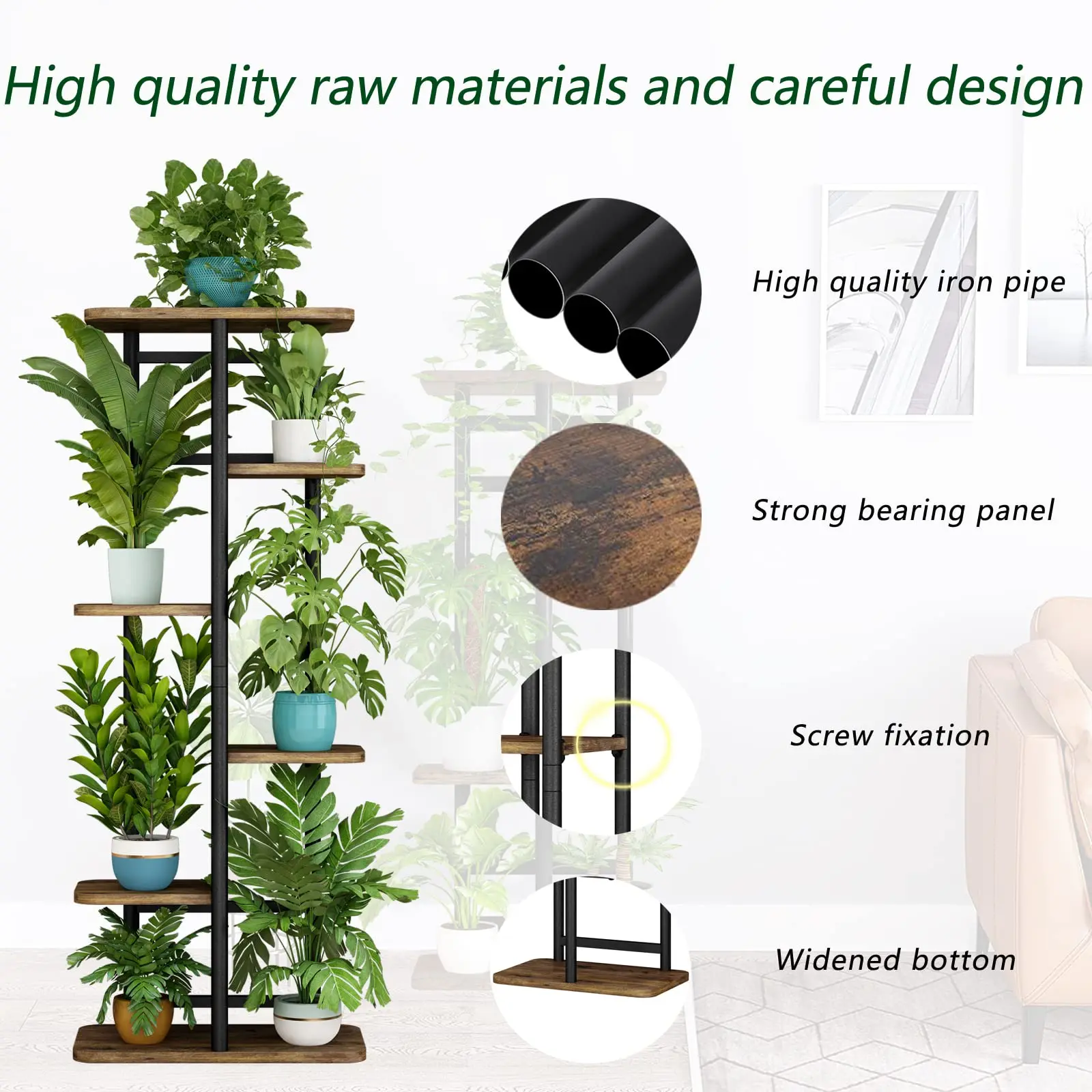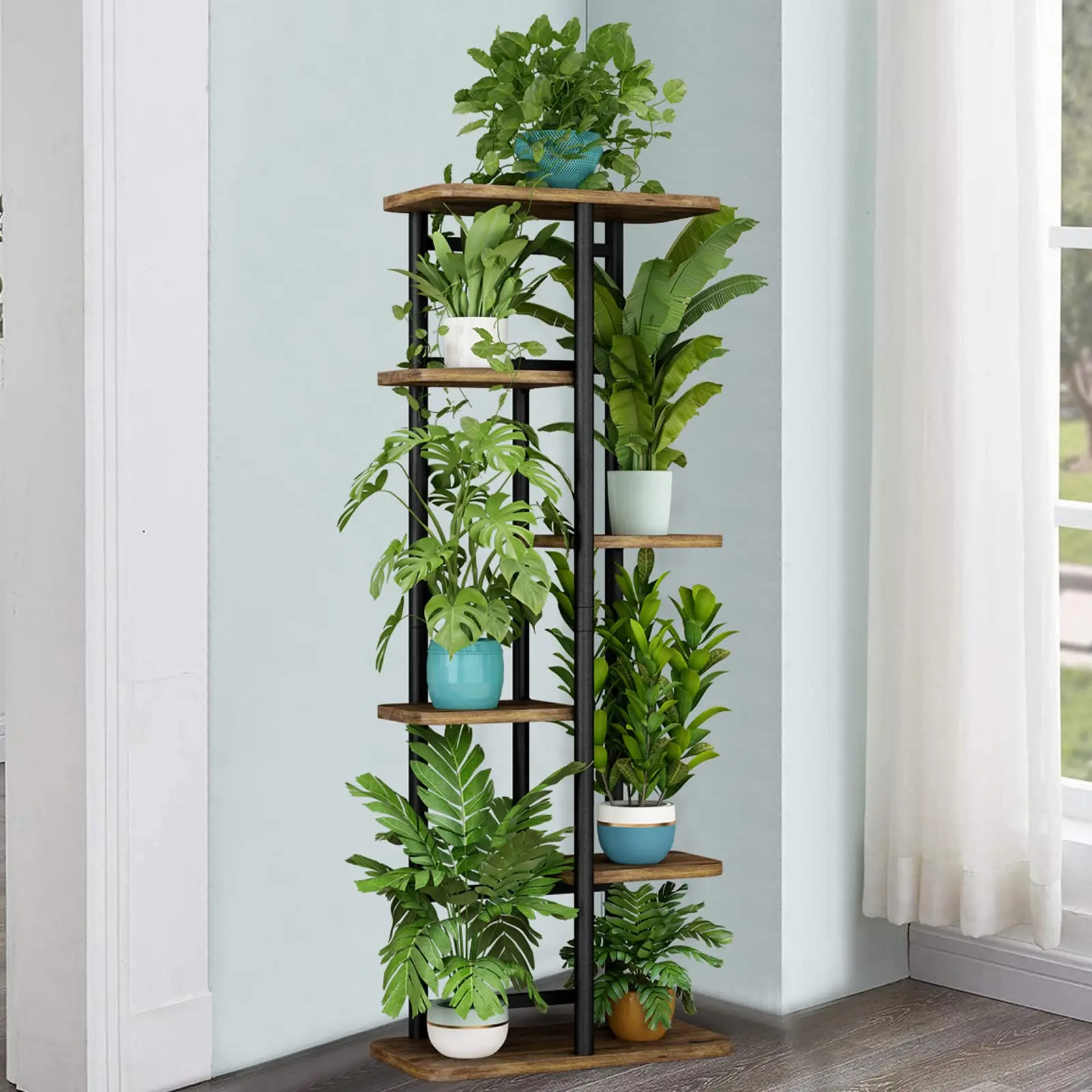✨ High-Quality Materials: Crafted from 100% pure iron and MDF, this plant stand boasts a smooth, burr-free surface. Easy maintenance and wiping make it user-friendly. It features 6 tiers, supporting up to 7 potted plants. Perfect for indoor and outdoor use, enhancing any corner, balcony, or room.