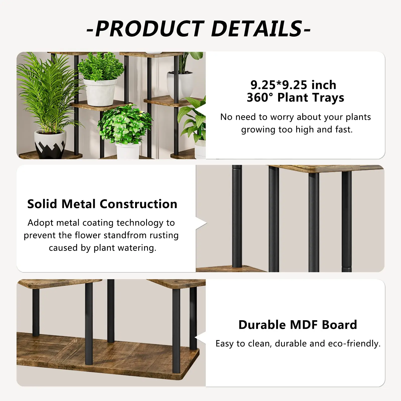 ·【Keep Balance & Stable】 The corner plant stand is mode of durable matal and MDF board, which has a smooth surface, with the function of compression resistance, waterproof, and stable structure. The bottom of the plant rack with6 anti-slip foot stickers , holding your heavy-duty potted plant securely without scratching the floor.