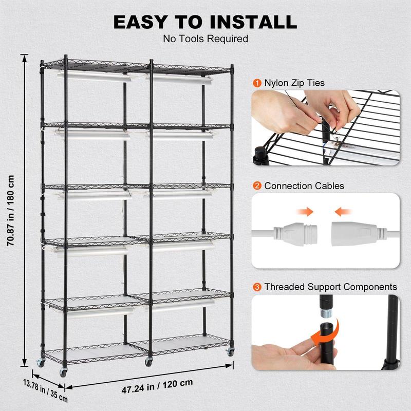 ·Convenient and Secure Design: The indoor greenhouse comes with adjustable grid height that accommodates plants of various sizes. Four heavy-duty industrial wheels make moving the rack effortless. The PP pads have a leak-proof design to avoid the light fixtures from water damage, enhancing security and usability.